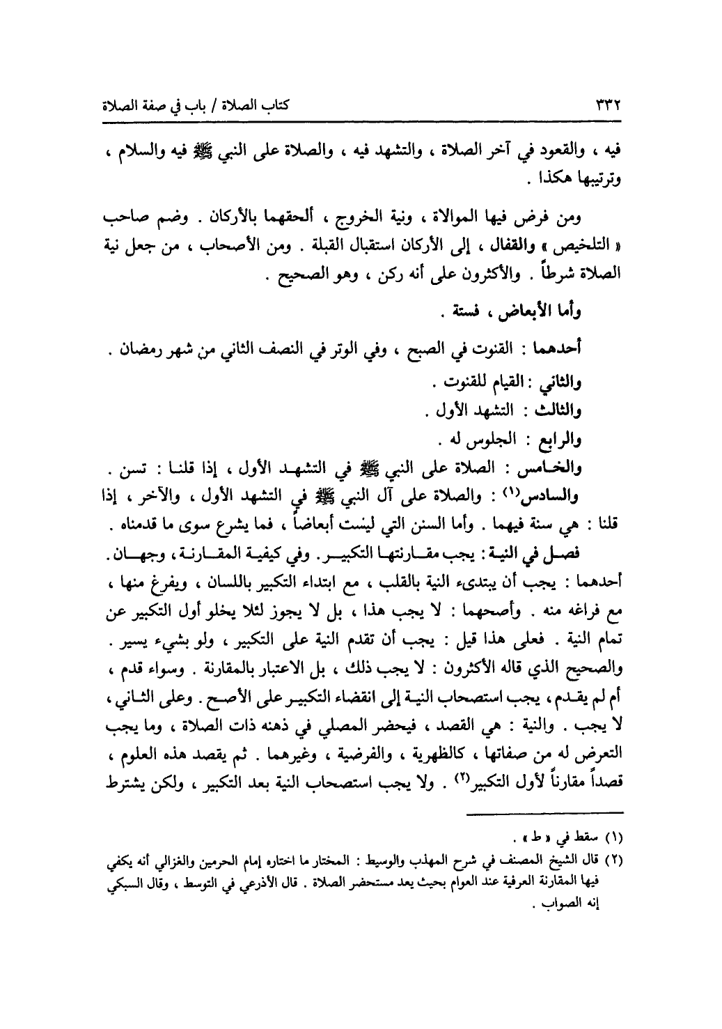 فيه، والقعود في آخر الصلاة، والتشهد فيه، والصلاة على النبي - صلى الله عليه وسلم - فيه والسلام، وترتيبها هكذا. ومن فرض فيها الموالاة، ونية الخروج ألحقهما بالاركان. وضم صاحب (التلخيص) والقفال، إلى الاركان استقبال القبلة. ومن الاصحاب، من جعل نية الصلاة شرطا. والكثرون على أنها ركن، وهو الصحيح. وأما الابعاض، فستة. أحدها: القنوت في الصبح، وفي الوتر في النصف الثاني من شهر رمضان. والثاني: القيام للقنوت. والثالث: التشهد الاول. والرابع: الجلوس له. والخامس: الصلاة على النبي - صلى الله عليه وسلم - في التشهد الاول، إذا قلنا: تسن. والسادس (1): والصلاة على آل النبي - صلى الله عليه وسلم - في التشهد الاول، والآخر، إذا قلنا: هي سنة فيهما. وأما السنن التي ليست أبعاضا، فما يشرع سوى ما قدمناه. فصل في النية: يجب مقارنتها التكبير. وفي كيفية المقارنة، وجهان. أحدهما: يجب أن يبتدئ النية بالقلب، مع ابتداء التكبير باللسان، ويفرغ منها، مع فراغه منه. وأصحهما: لا يجب هذا، بل لا يجوز لئلا يخلو أول التكبير عن تمام النية. فعلى هذا قيل: يجب أن تقدم النية على التكبير، ولو بشئ يسير. والصحيح الذي قاله الاكثرون: لا يجب ذلك، بل الاعتبار بالمقارنة. وسواء قدم، أم لم يقدم، يجب استصحاب النية إلى انقضاء التكبير على الاصح وعلى الثاني، لا يجب. والنية: هي القصد، فيحضر المصلي في ذهنه ذات الصلاة، وما يجب التعرض له من صفاتها، كالظهرية، والفرضية، وغيرهما. ثم يقصد هذه العلوم، قصدا مقارنا لاول التكبير (2). ولا يجب استصحاب النية بعد التكبير، ولكن يشترط
