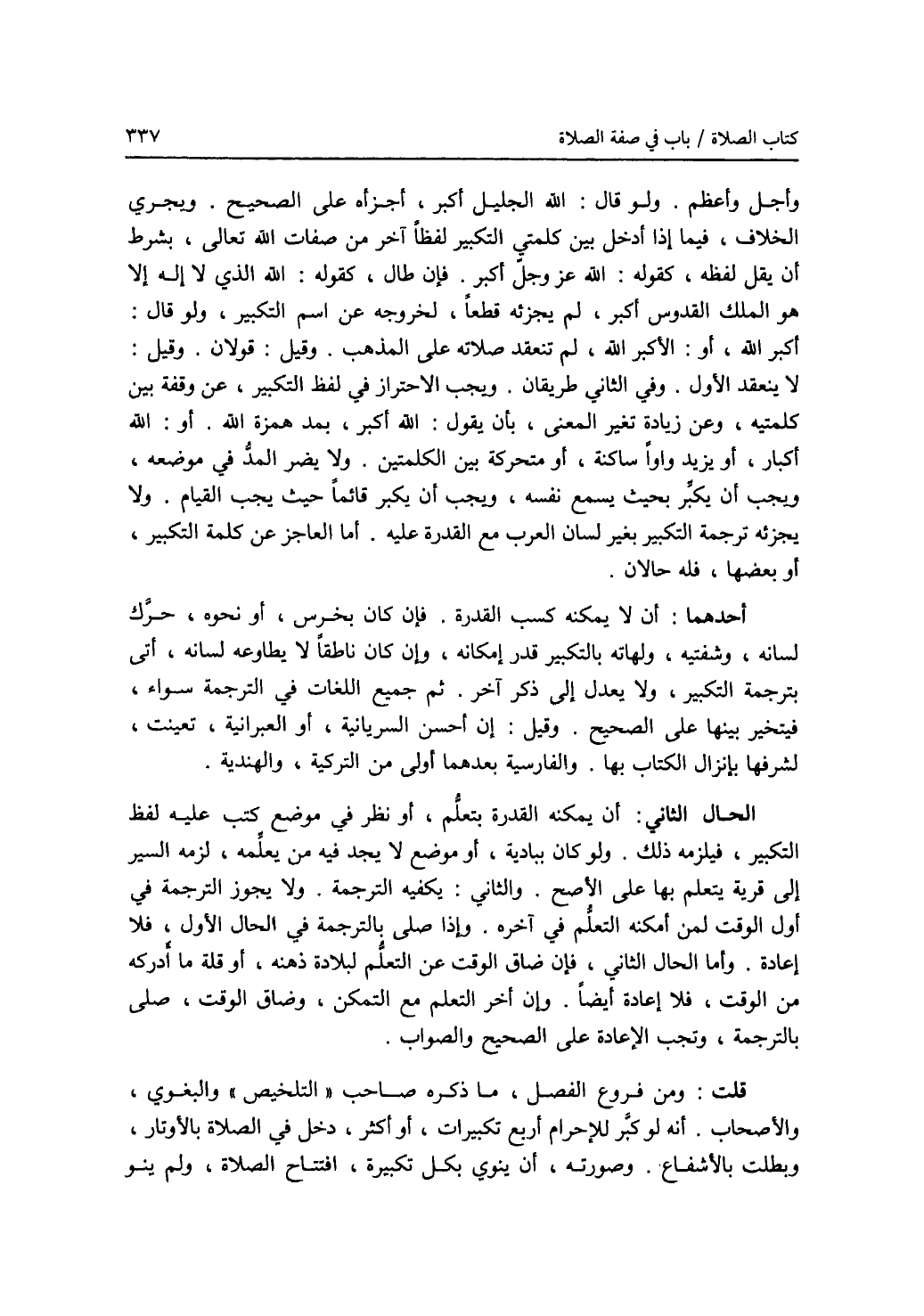 وأجل وأعظم. ولو قال: الله الجليل أكبر، أجزأه على الصحيح. ويجري الخلاف، فيما إذا أدخل بين كلمتي التكبير لفظا آخر من صفات الله تعالى، بشرط أن يقل لفظه، كقوله: الله عزوجل أكبر. فإن طال، كقوله: الله الذي لا إله إلا هو الملك القدوس أكبر، لم يجزئه قطعا، لخروجه عن اسم التكبير، ولو قال: أكبر الله، أو: الاكبر الله، لم تنعقد صلاته على المذهب. وقيل: قولان. وقيل: لا ينعقد الاول. وفي الثاني الطريقان. ويجب الاحتراز في لفظ التكبير، عن وقفة بين كلمتيه، وعن زيادة تغير المعنى، بأن يقول: الله أكبر، بمد همزة الله. أو: الله أكبار، أو يزيد واوا ساكنة، أو متحركة بين الكلمتين. ولا يضر المد في موضعه، ويجب أن يكبر بحيث يسمع نفسه، ويجب أن يكبر قائما حيث يجب القيام. ولا يجزئه ترجمة التكبير بغير لسان العرب مع القدرة عليه. أما العاجز عن كلمة التكبير، أو بعضها، فله حالان. أحدهما: أن لا يمكنه كسب القدرة. فإن كان بخرس، أو نحوه، حرك لسانه، وشفتيه، ولهاته بالتكبير قدر إمكانه، وإن كان ناطقا لا يطاوعه لسانه، أتى بترجمة التكبير، ولا يعدل إلى ذكر آخر. ثم جميع اللغات في الترجمة سواء، فيتخير بينها على الصحيح. وقيل: إن أحسن السريانية، أو العبرانية، تعينت، لشرفها بإنزال الكتاب بها. والفارسية بعدهما أولى من التركية، والهندية. الحال الثاني: أن يمكنه القدرة بتعلم، أو نظر في موضع كتب عليه لفظ التكبير، فيلزمه ذلك. ولو كان ببادية، أو موضع لا يجد فيه من يعلمه، لزمه السير إلى قرية يتعلم بها على الاصح. والثاني: يكفيه الترجمة. ولا يجوز في أول الوقت لمن أمكنه التعلم في آخره. وإذا صلى بالترجمة في الحال الاول، فلا إعادة. وأما الحال الثاني، فإن ضاق الوقت عن التعلم لبلادة ذهنه، أو قلة ما أدركه من الوقت، فلا إعادة أيضا. وإن أخر التعلم مع التمكن، وضاق الوقت، صلى بالترجمة، وتجب الاعادة على الصحيح والصواب. قلت: ومن فروع الفصل، ما ذكره صاحب (التلخيص) والبغوي، والاصحاب. أنه لو كبر للاحرام أربع تكبيرات، أو أكثر، دخل في الصلاة بالاوتار، وبطلت بالاشفاع. وصورته، أن ينوي بكل تكبيرة، افتتاح الصلاة، ولم ينو