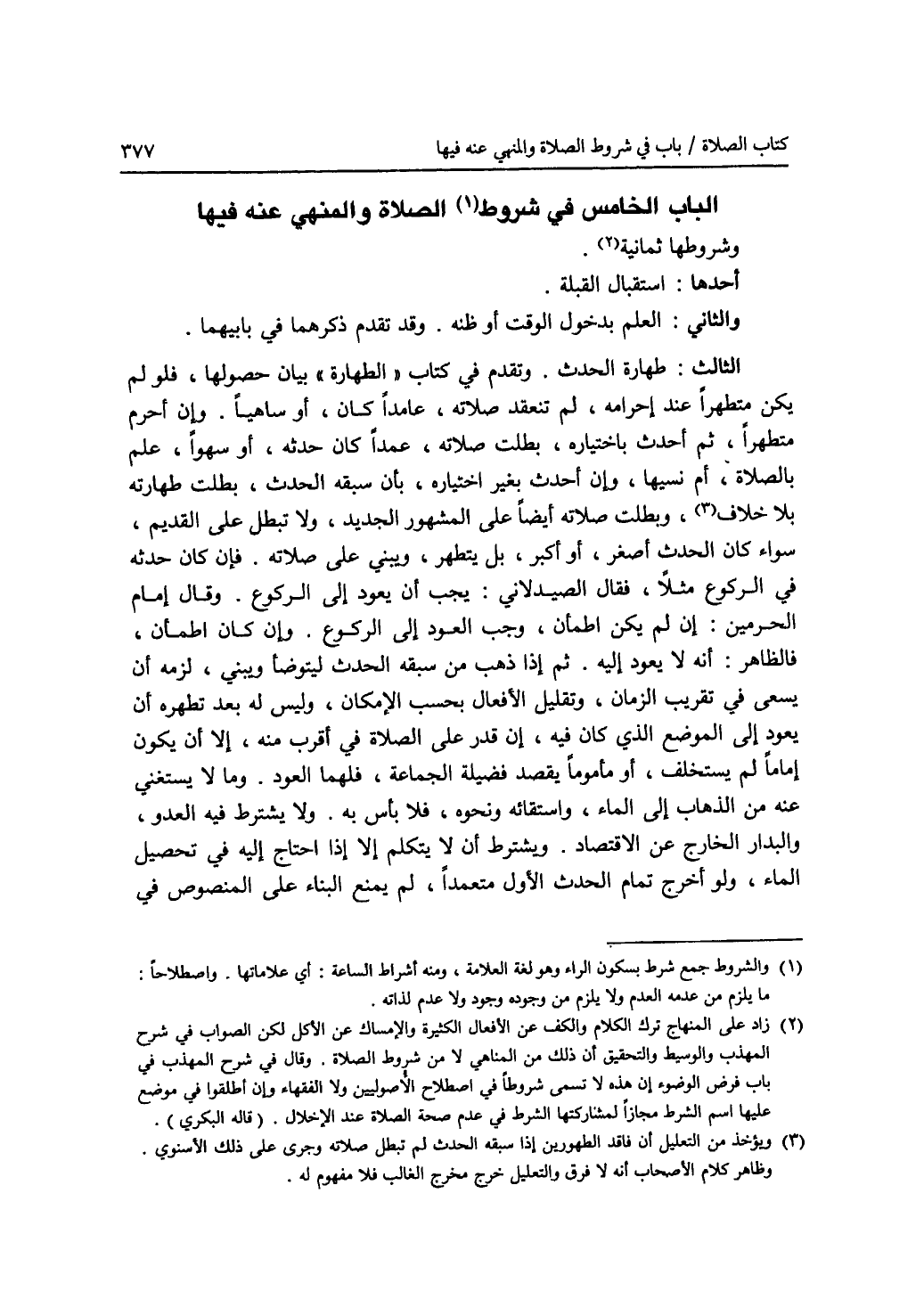 الباب الخامس في شروط (1) الصلاة والمنهي عنه فيها وشروطها ثمانية (2). أحدها: استقبال القبلة. والثاني: العلم بدخول الوقت أو ظنه. وقد تقدم ذكرهما في بابيهما. الثالث: طهارة الحدث. وتقدم في كتاب (الطهارة) بيان حصولها. فلو لم يكن متطهرا عند إحرامه لم تنعقد صلاته، عامدا كان، أو ساهيا. وإن أحرم متطهرا، ثم أحدث باختياره، بطلت صلاته، عمدا كان حدثه، أو سهوا، علم بالصلاة، أم نسيها. وإن أحدث بغير اختياره، بأن سبقه الحدث، بطلت طهاراته بلا خلاف (3)، وبطلت صلاته أيضا على المشهور الجديد، ولا تبطل على القديم، سواء كان الحدث أصغر، أو أكبر، بل يتطهر، ويبني على صلاته. فإن كان حدثه في الركوع مثلا، فقال الصيدلاني: يجب أن يعود إلى الركوع. وقال إمام الحرمين: إن لم يكن اطمأن، وجب العود إلى الركوع. وإن كان اطمأن، فالظاهر: أنه لا يعود إليه. ثم إذا ذهب من سبقه الحدث ليتوضأ ويبني، لزمه أن يسعى في تقريب الزمان، وتقليل الافعال بحسب الامكان، وليس له بعد تطهره أن يعود إلى الموضع الذي كان فيه، إن قدر على الصلاة في أقرب منه، إلا أن يكون إماما لم يستخلف، أو مأموما يقصد فضيلة الجماعة، فلهما العود. وما لا يستغنى عنه من الذهاب إلى الماء واستقائه ونحوه، فلا بأس به. ولا يشترط فيه العدو، والبدار الخارج عن الاقتصاد. ويشترط أن لا يتكلم إلا إذا احتاج إليه في تحصيل الماء، ولو أخرج تمام الحدث الاول متعمدا، لم يمنع البناء على المنصوص في