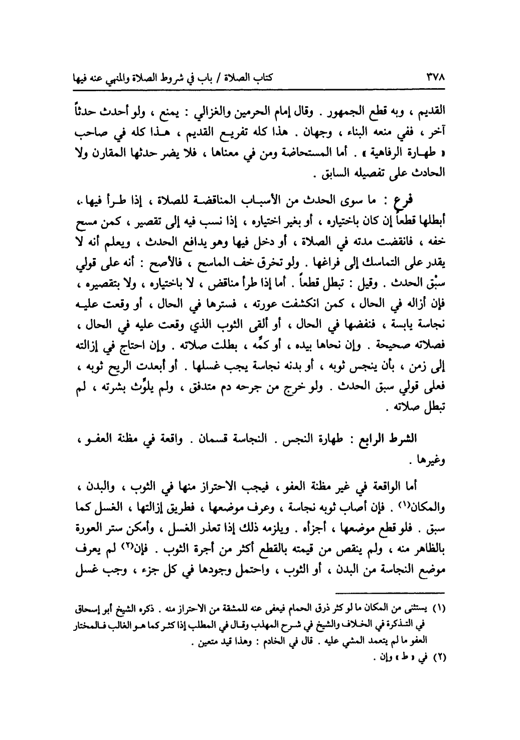 القديم، وبه قطع الجمهور. وقال إمام الحرمين، والغزالي: يمنع، ولو أحدث حدثا آخر، ففي منعه البناء، وجهان. هذا كله تفريع القديم، هذا كله في صاحب (طهارة الرفاهية). أما المستحاضة ومن في معناها، فلا يضر حدثها المقارن ولا الحادث على تفصيله السابق. فرع: ما سوى الحدث من الاسباب المناقضة للصلاة، إذا طرأ فيها، أبطلها قطعا إن كان باختياره، أو بغير اختياره، إذا نسب فيه إلى تقصير، كمن مسح خفه، فانقضت مدته في الصلاة، أو دخل فيها وهو يدافع الحدث، ويعلم أنه لا يقدر على التماسك إلى فراغها. ولو تخرق خف الماسح، فالاصح: أنه على قولي سبق الحدث. وقيل: تبطل قطعا. أما إذا طرأ مناقض، لا باختياره، ولا بتقصيرة، فإن أزاله في الحال، كمن انكشفت عورته، فسترها في الحال، أو وقعت عليه نجاسة يابسة، فنفضها في الحال، أو ألقى الثوب الذي وقعت عليه في الحال، فصلاته صحيحة. وإن نحاها بيده، أو كمه، بطلت صلاته. وإن احتاج في إزالته إلى زمن، بأن ينجس ثوبه، أو بدنه نجاسة يجب غسلها. أو أبعدت الريح ثوبه، فعلى قولي سبق الحدث. ولو خرج من جرحه دم متدفق، ولم يلوث بشرته، لم تبطل صلاته. الشرط الرابع: طهارة النجس. النجاسة قسمان. واقعة في مظنة العفو، وغيرها. أما الواقعة في غير مظنة العفو، فيجب الاحتراز منها في الثوب، والبدن، والمكان (1). فإن أصاب ثوبه نجاسة وعرف موضعها، فطريق إزالتها، الغسل كما سبق. فلو قطع موضعها، أجزأه. ويلزمه ذلك إذا تعذر الغسل، وأمكن ستر العورة بالظاهر منه، ولم ينقص من قيمته بالقطع أكثر من أجرة الثوب. فإن (2) لم يعرف موضع النجاسة من البدن، أو الثوب، واحتمل وجودها في كل جزء، وجب غسل