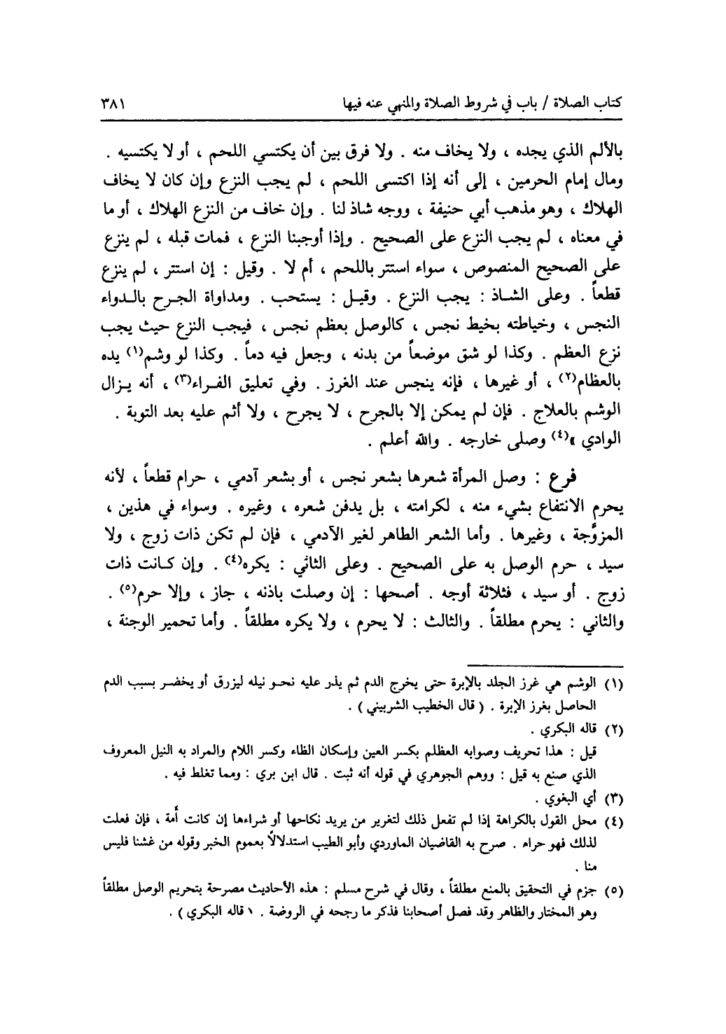 بالالم الذي يجده، ولا يخاف منه. ولا فرق بين أن يكتسي اللحم، أو لا يكتسيه. ومال إمام الحرمين، إلى أنه إذا اكتسى اللحم، لم يجب النزع، وإن كان لا يخاف الهلاك، وهو مذهب أبي حنيفة، ووجه شاذ لنا. وإن خاف من النزع الهلاك، أو ما في معناه، لم يجب النزع على الصحيح. وإذا أوجبنا النزع، فمات قبله، لم ينزع على الصحيح المنصوص، سواء استتر باللحم، أم لا. وقيل: إن استتر، لم ينزع قطعا. وعلى الشاذ: يجب النزع. وقيل: يستحب. ومداواة الجرح بالدواء النجس، وخياطته بخيط نجس، كالوصل بعظم نجس، فيجب النزع حيث يجب نزع العظم. وكذا لو شق موضعا من بدنه، وجعل فيه دما. وكذا لو وشم (1) يده بالعظام (2)، أو غيرها، فانه ينجس عند الغرز. وفي تعليق الفراء (3)، أنه يزال الوشم بالعلاج. فإن لم يمكن إلا بالجرح، لا يجرح، ولا إثم عليه بعد التوبة. والوادي) (4) وصلى خارجه. والله أعلم. فرع: وصل المرأة شعرها بشعر نجس، أو بشعر آدمي، حرام قطعا، لانه يحرم الانتفاع بشئ منه، لكرامته، بل يدفن شعره، وغيره. وسواء في هذين، المزوجة، وغيرها. وأما الشعر الطاهر لغير الآدمي، فإن لم تكن ذات زوج، ولا سيد، حرم الوصل به على الصحيح. وعلى الثاني: يكره (4). وإن كانت ذات زوج. أو سيد، فثلاثة أوجه. أصحها: إن وصلت بإذنه، جاز، وإلا حرم (5). والثاني: يحرم مطلقا. والثالث: لا يحرم، ولا يكره مطلقا. وأما تحمير الوجنة،
