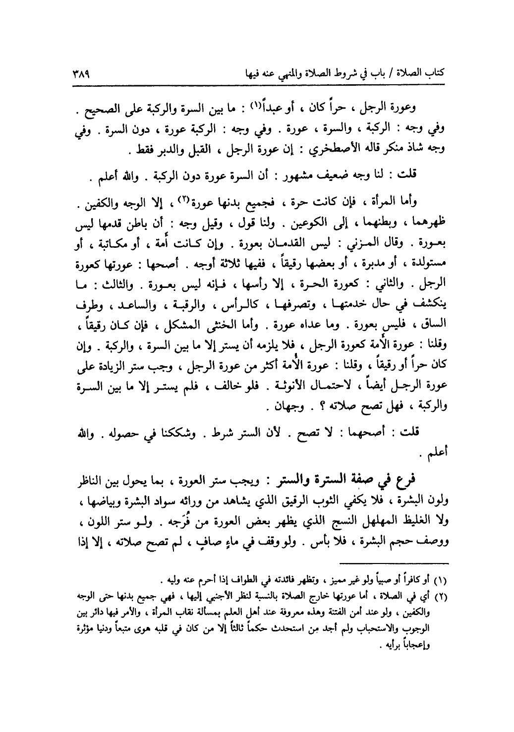 وعورة الرجل، حرا كان أو عبدا (1): ما بين السرة والركبة على الصحيح. وفي وجه: الركبة، والسرة، عورة. وفي وجه: الركبة عورة، دون السرة. وفي وجه شاذ منكر قاله الاصطخري: إن عورة الرجل، القبل والدبر فقط. قلت: لنا وجه ضعيف مشهور: أن السرة عورة دون الركبة. والله أعلم. وأما المرأة، فإن كانت حرة، فجميع بدنها عورة (2)، إلا الوجه والكفين. ظهرهما، وبطنهما، إلى الكوعين. ولنا قول، وقيل وجه: أن باطن قدمها ليس بعورة. وقال المزني: ليس القدمان بعورة. وإن كانت أمة، أو مكاتبة، أو مستولدة، أو مدبرة، أو بعضها رقيقا، ففيها ثلاثة أوجه. أصحها: عورتها كعورة الرجل. والثاني: كعورة الحرة، إلا رأسها، فإنه ليس بعورة، والثالث: ما ينكشف في حال خدمتها، وتصرفها، كالرأس، والرقبة، والساعد، وطرف الساق، فليس بعورة. وما عداه عورة. وأما الخنثى المشكل، فإن كان رقيقا، وقلنا: عورة الامة كعورة الرجل، فلا يلزمه أن يستر إلا ما بين السرة، والركبة. وإن كان حرا أو رقيقا، وقلنا: عورة الامة أكثر من عورة الرجل، وجب ستر الزيادة على عورة الرجل أيضا، لاحتمال الانوثة. فلو خالف، فلم يستر إلا ما بين السرة والركبة، فهل تصح صلاته ؟ وجهان. قلت: أصحهما: لا تصح. لان الستر شرط. وشككنا في حصوله. والله أعلم. فرع في صفة السترة والستر: ويجب ستر العورة، بما يحول بين الناظر ولون البشرة، فلا يكفي الثوب الرقيق الذي يشاهد من ورائه سواد البشرة وبياضها، ولا الغليظ المهلهل النسج الذي يظهر بعض العورة من فرجه. ولو ستر اللون، ووصف حجم البشرة، فلا بأس. ولا وقف في ماء صاف، لم تصح صلاته، إلا إذا