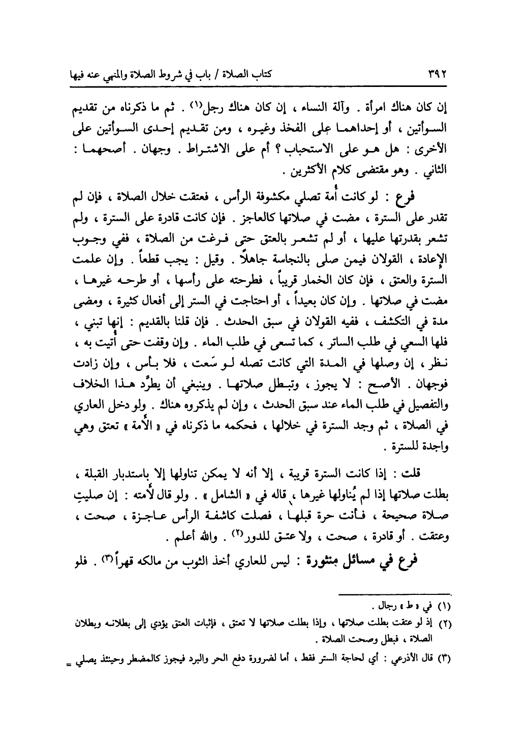 إن كان هناك امرأة. وآلة النساء، إن كان هناك رجل (1). ثم ما ذكرناه من تقديم السوأتين، أو إحداهما على الفخذ وغيره، ومن تقديم إحدى السوأتين على الاخرى: هل هو على الاستحباب ؟ أم على الاشتراط. وجهان. أصحهما: الثاني. وهو مقتضى كلام الاكثرين. فرع: لو كانت أمة تصلي مكشوفة الرأس، فعتقت خلال الصلاة، فإن لم تقدر على السترة، مضت في صلاتها كالعاجز. فإن كانت قادرة على السترة، ولم تشعر بقدرتها عليها، أو لم تشعر بالعتق حتى فرغت من الصلاة، ففي وجوب الاعادة، القولان فيمن صلى بالنجاسة جاهلا. وقيل: يجب قطعا. وإن علمت السترة والعتق، فإن كان الخمار قريبا، فطرحته على رأسها، أو طرحه غيرها، مضت في صلاتها. وإن كان بعيدا، أو احتاجت في الستر إلى أفعال كثيرة، ومضى مدة في التكشف، ففيه القولان في سبق الحدث. فإن قلنا بالقديم: إنها تبني، فلها السعي في طلب الساتر، كما تسعى في طلب الماء. وإن وقفت حتى أتيت به، نظر، إن وصلها في المدة التي كانت تصله لو سعت، فلا بأس، وإن زادت، فوجهان. الاصح: لا يجوز، وتبطل صلاتها. وينبغي أن يطرد هذا الخلاف والتفصيل في طلب الماء عند سبق الحدث، وإن لم يذكروه هناك. ولو دخل العاري في الصلاة ثم وجد السترة في خلالها، فحكمه ما ذكرناه في (الامة) تعتق وهي واجدة للسترة. قلت: إذا كانت السترة قريبة، إلا أنه لا يمكن تناولها إلا باستدبار القبلة، بطلت صلاتها إذا لم يناولها غيرها، قاله في (الشامل). ولو قال لامته: إن صليت صلاة صحيحة، فأنت حرة قبلها، فصلت كاشفة الرأس عاجزة، صحت، وعتقت. أو قادرة، صحت، ولا عتق للدور (2). والله أعلم. فرع في مسائل منثورة: ليس للعاري أخذ الثوب من مالكه قهرا (3). فلو