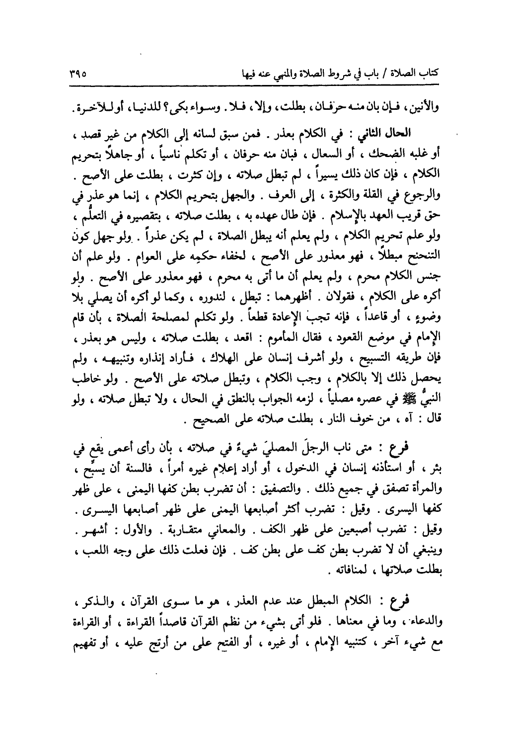 والانين، فإن بان منه حرفان، بطلت، وإلا، فلا. وسواء بكى ؟ للدنيا، أو للآخرة. الحال الثاني: في الكلام بعذر. فمن سبق لسانه إلى الكلام من غير قصد، أو غلبه الضحك، أو السعال، فبان منه حرفان، أو تكلم ناسيا، أو جاهلا بتحريم الكلام، فإن كان ذلك يسيرا، لم تبطل صلاته، وإن كثرت، بطلت على الاصح. والرجوع في القلة والكثرة، إلى العرف. والجهل بتحريم الكلام، إنما هو عذر في حق قريب العهد بالاسلام. فإن طال عهده به، بطلت صلاته، لتقصيره في التعلم. ولو علم تحريم الكلام، ولم يعلم أنه يبطل الصلاة، لم يكن عذرا. ولو جهل كون التنحنح مبطلا، فهو معذور على الاصح، لخفاء حكمه على العوام. ولو علم أن جنس الكلام محرم، ولم يعلم أن ما أتى به محرم، فهو معذور على الاصح. ولو أكره على الكلام، فقولان. أظهرهما: تبطل، لندوره، وكما لو أكره أن يصلي بلا وضوء، أو قاعدا، فإنه تجب الاعادة قطعا. ولو تكلم لمصلحة الصلاة، بأن قام الامام في موضع القعود، فقال المأموم: اقعد، بطلت صلاته، وليس هو بعذر، فإن طريقه التسبيح، ولو أشرف انسان على الهلاك، فأراد انذاره وتنبيهه، ولم يحصل ذلك إلا بالكلام، وجب الكلام، وتبطل صلاته على الاصح. ولو خاطب النبي - صلى الله عليه وسلم - في عصره مصليا، لزمه الجواب بالنطق في الحال، ولا تبطل صلاته، ولو قال: آه، من خوف النار، بطلت صلاته على الصحيح. فرع: متى ناب الرجل المصلي شئ في صلاته، بأن رأى أعمى يقع في بئر، أو استأذنه انسان في الدخول، أو أراد إعلام غيره أمرا، فالسنة أن يسبح، والمرأة تصفق في جميع ذلك. والتصفيق: أن تضرب بطن كفها اليمنى، على ظهر كفها اليسرى. وقيل: تضرب أكثر أصابعها اليمنى على ظهر أصابعها اليسرى. وقيل: تضرب أصبعين على ظهر الكف. والمعاني متقاربة. والاول: أشهر. وينبغي أن لا تضرب بطن كف على بطن كف. فإن فعلت ذلك على وجه اللعب، بطلت صلاتها، لمنافاته. فرع: الكلام المبطل عند عدم العذر، هو ما سوى القرآن، والذكر، والدعاء، وما في معناها. فلو أتى بشئ من نظم القرآن قاصدا القراءة، أو القراءة مع شئ آخر، كتنبيه الامام، أو غيره، أو الفتح على من أرتج عليه، أو تفهيم