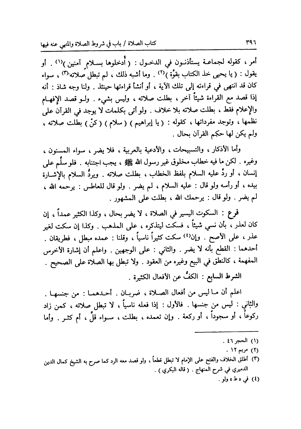 أمر كقوله لجماعة يستأذنون في الدخول: * (أدخلوها بسلام آمنين) (1) *. أو يقول: * (يا يحيى خذ الكتاب بقوة) * (2). وما أشبه ذلك، لم تبطل صلاته (3)، سواء كان قد انتهى في قراءته إلى تلك الآية، أو أنشأ قراءتها حينئذ. ولنا وجه شاذ: أنه إذا قصد مع القراءة شيئا آخر، بطلت صلاته، وليس بشئ. ولو قصد الافهام والاعلام فقط، بطلت صلاته بلا خلاف. ولو أتى بكلمات لا يوجد في القرآن على نظمها، وتوجد مفرداتها، كقوله: (يا إبرهيم) (سلام) (كن) بطلت صلاته، ولم يكن لها حكم القرآن بحال. وأما الاذكار، والتسبيحات، والادعية بالعربية، فلا يضر، سواء المسنون، وغيره. لكن ما فيه خطاب مخلوق غير رسول الله - صلى الله عليه وسلم -، يجب اجتنابه. فلو سلم على إنسان، أو رد عليه السلام بلفظ الخطاب، بطلت صلاته. ويرد السلام بالاشارة بيده، أو رأسه ولو قال: عليه السلام، لم يضر. ولو قال للعاطس: يرحمه الله، لم يضر. ولو قال: يرحمك الله، بطلت على المشهور. فرع: السكوت اليسير في الصلاة، لا يضر بحال، وكذا الكثير عمدا، إن كان لعذر، بأن نسي شيئا، فسكت ليتذكره، على المذهب. وكذا إن سكت لغير عذر، على الاصح. وإن (4) سكت كثيرا ناسيا، وقلنا: عمده مبطل، فطريقان. أحدهما: القطع بأنه لا يضر. والثاني: على الوجهين. واعلم أن إشارة الاخرس المفهمة، كالنطق في البيع وغيره من العقود. ولا تبطل بها الصلاة على الصحيح. الشرط السابع: الكف عن الافعال الكثيرة. اعلم أن ما ليس من أفعال الصلاة، ضربان. أحدهما: من جنسها. والثاني: ليس من جنسها. فالاول: إذا فعله ناسيا، لا تبطل صلاته، كمن زاد ركوعا، أو سجودا، أو ركعة. وإن تعمده، بطلت، سواء قل، أم كثر. وأما