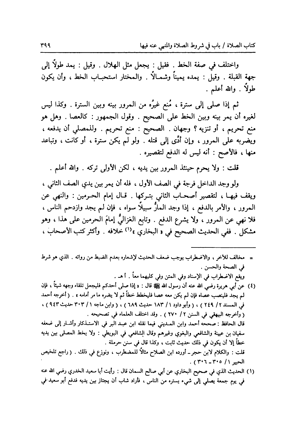 واختلف في صفة الخط. فقيل: يجعل مثل الهلال. وقيل: يمد طولا إلى جهة القبلة. وقيل: يمده يمينا وشمالا. والمختار استحباب الخط، وأن يكون طولا. والله أعلم. ثم إذا صلى إلى سترة، منع غيره من المرور بينه وبين السترة. وكذا ليس لغيره أن يمر بينه وبين الخط على الصحيح. وقول الجمهور: كالعصا. وهل هو منع تحريم، أو تنزيه ؟ وجهان. الصحيح: منع تحريم. وللمصلي أن يدفعه، ويضربه على المرور، وإن أدى إلى قتله. ولو لم يكن سترة، أو كانت، وتباعد منها، فالاصح: أنه ليس له الدفع لتقصيره. قلت: ولا يحرم حينئذ المرور بين يديه، لكن الاولى تركه. والله أعلم. ولو وجد الداخل فرجة في الصف الاول، فله أن يمر بين يدي الصف الثاني، ويقف فيها، لتقصير أصحاب الثاني بتركها. قال إمام الحرمين: والنهي عن المرور، والامر بالدفع، إذا وجد المار سبيلا سواه، فإن لم يجد وازدحم الناس، فلا نهي عن المرور، ولا يشرع الدفع. وتابع الغزالي إمام الحرمين على هذا، وهو مشكل. ففي الحديث الصحيح في (البخاري) (1) خلافه. وأكثر كتب الاصحاب،