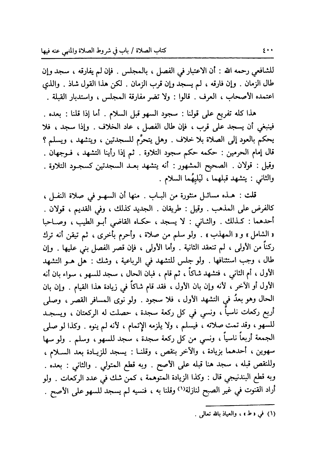 للشافعي رحمه الله: أن الاعتبار في الفصل، بالمجلس. فإن لم يفارقه، سجد وإن طال الزمان. وإن فارقه، لم يسجد وإن قرب الزمان. لكن هذا القول شاذ. والذي اعتمده الاصحاب، العرف. قالوا: ولا تضر مفارقة المجلس، واستدبار القبلة. هذا كله تفريع على قولنا: سجود السهو قبل السلام. أما إذا قلنا: بعده. فينبغي أن يسجد على قرب، فإن طال الفصل، عاد الخلاف. وإذا سجد، فلا يحكم بالعود إلى الصلاة بلا خلاف. هل يتحرم للسجدتين، ويتشهد، ويسلم ؟ قال إمام الحرمين: حكمة حكم سجود التلاوة. ثم إذا رأينا التشهد، فوجهان. وقيل: قولان الصحيح المشهور: أنه يتشهد بعد السجدتين كسجود التلاوة. والثاني: يتشهد قبلهما، ليليهما السلام. قلت: هذه مسائل منثورة من الباب. منها أن السهو في الصلاة النفل، كالفرض على المذهب. وقيل: طريقان. الجديد كذلك، وفي القديم، قولان. أحدهما: كذلك. والثاني: لا يسجد، حكاه القاضي أبو الطيب، وصاحبا (الشامل) و (المهذب). ولو سلم من الصلاة وأحرم بأخرى، ثم تيقن أنه ترك ركنا من الاولى، لم تنعقد الثانية. وأما الاولى، فإن قصر الفصل بني عليها. وإن طال، وجب استئنافها. ولو جلس للتشهد في الرباعية، وشك: هل هو التشهد الاول، أم الثاني، فتشهد شاكا، ثم قام، فبان الحال، سجد للسهو، سواء بان أنه الاول، أو الآخر، لانه وإن بان الاول، فقد قام شاكا في زيادة هذا القيام. وأن بان الحال وهو بعد في التشهد الاول، فلا سجود. ولو نوى المسافر القصر، وصلى أربع ركعات ناسيا، ونسي في كل ركعة سجدة، حصلت له الركعتان، ويسجد للسهو، وقد تمت صلاته، فيسلم، ولا يلزمه الاتمام، لانه لم ينوه. وكذا لو صلى الجمعة أربعا ناسيا، ونسي من كل ركعة سجدة، سجد للسهو، وسلم. ولو سها سهوين، أحدهما بزيادة، والآخر بنقص، وقلنا: يسجد للزيادة بعد السلام، وللنقص قبله، سجد هنا قبله على الاصح. وبه قطع المتولي. والثاني. بعده. وبه قطع البندنيجي قال: وكذا الزيادة المتوهمة، كمن شك في عدد الركعات. ولو أراد القنوت في غير الصبح لنازلة (1) وقلنا به، فنسيه لم يسجد للسهو على الاصح.