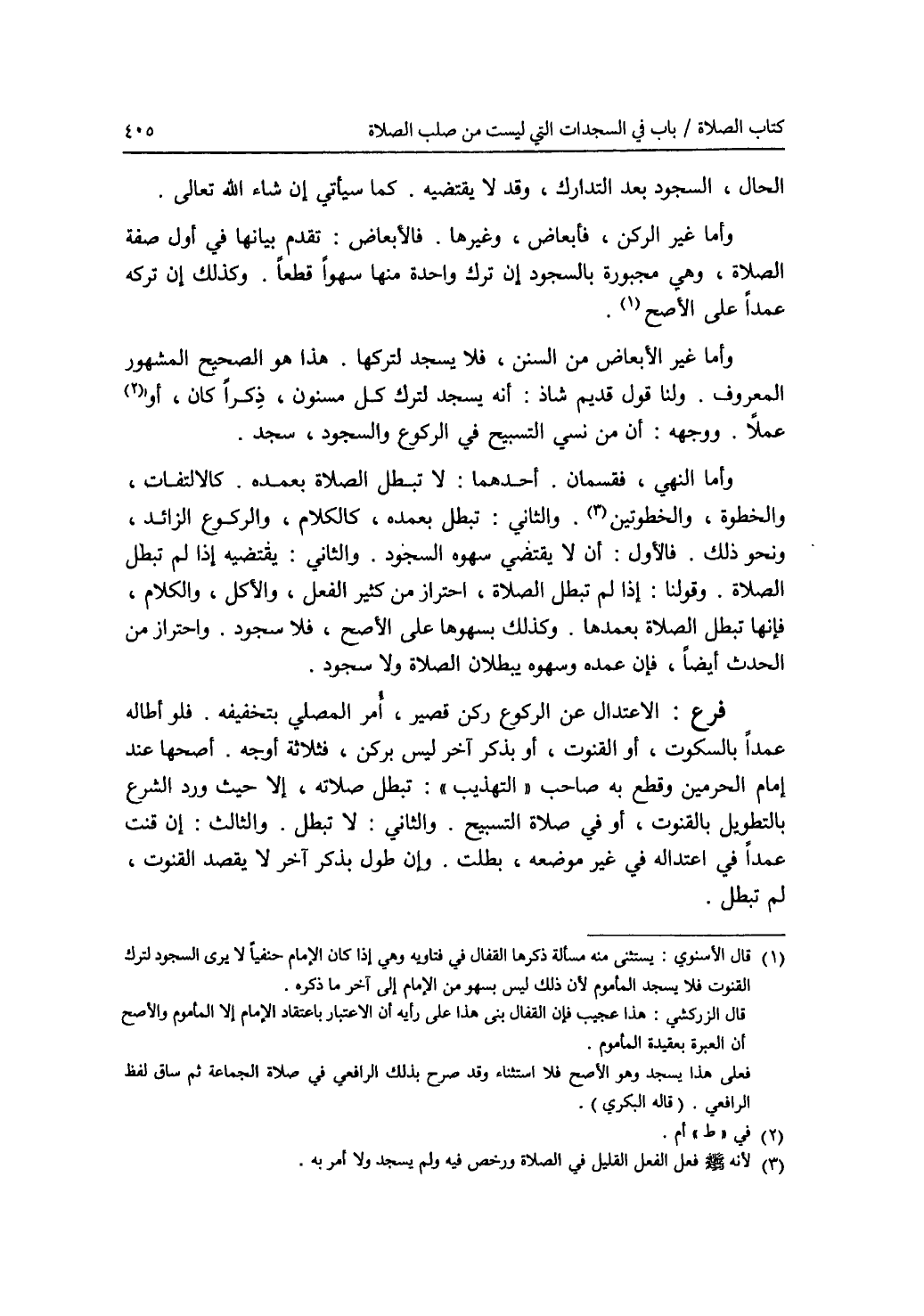 الحال، السجود بعد التدارك، وقد لا يقتضيه. كما سيأتي إن شاء الله تعالى. وأما غير الركن، فأبعاض، وغيرها. فالابعاض: تقدم بيانها في أول صفة الصلاة، وهي مجبورة بالسجود إن ترك واحدة منها سهوا قطعا. وكذلك إن تركه عمدا على الاصح (1). وأما غير الابعاض من السنن، فلا يسجد لتركها. هذا هو الصحيح المشهور المعروف. ولنا قول قديم شاذ: أنه يسجد لترك كل مسنون، ذكرا كان، أو (2) عملا. ووجهه: أن من نسي التسبيح في الركوع والسجود، سجد. وأما المنهي، فقسمان. أحدهما: لا تبطل الصلاة بعمده. كالالتفات، والخطوة، والخطوتين (3). والثاني: تبطل بعمده، كالكلام، والركوع الزائد، ونحو ذلك. فالاول: أن لا يقتضي سهوه السجود. والثاني: يقتضيه إذا لم تبطل الصلاة. وقولنا: إذا لم تبطل الصلاة، احتراز من كثير الفعل، والاكل، والكلام، فإنها تبطل الصلاة بعمدها. وكذلك بسهوها على الاصح، فلا سجود. واحتراز من الحدث أيضا، فإن عمده وسهوه يبطلان الصلاة ولا سجود. فرع: الاعتدال عن الركوع ركن قصير، أمر المصلي بتخفيفه. فلو أطاله عمدا بالسكوت، أو القنوت، أو بذكر آخر ليس بركن، فثلاثة أوجه. أصحها عند إمام الحرمين وقطع به صاحب (التهذيب): تبطل صلاته، إلا حيث ورد الشرع بالتطويل بالقنوت، أو في صلاة التسبيح. والثاني: لا تبطل. والثالث: إن قنت عمدا في اعتداله في غير موضعه، بطلت. وإن طول بذكر آخر لا يقصد القنوت، لم تبطل.
