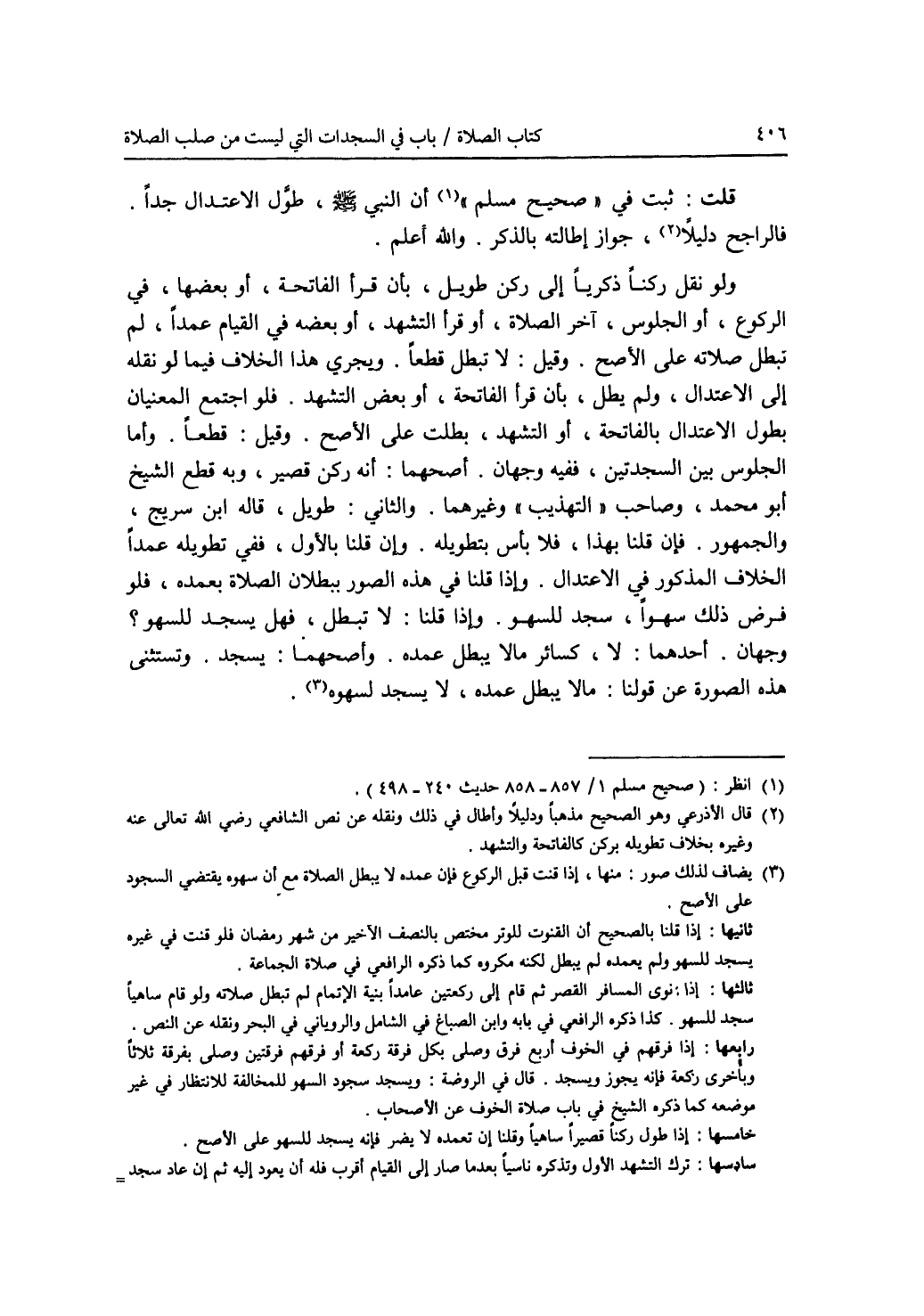 قلت: ثبت في (صحيح مسلم) (1) أن النبي - صلى الله عليه وسلم -، طول الاعتدال جدا. فالراجح دليلا (2)، جواز إطالته بالذكر. والله أعلم. ولو نقل ركنا ذكريا إلى ركن طويل، بأن قرأ الفاتحة، أو بعضها، في الركوع، أو الجلوس، آخر الصلاة، أو قرأ التشهد، أو بعضه في القيام عمدا، لم تبطل صلاته على الاصح. وقيل: لا تبطل قطعا. ويجري هذا الخلاف فيما لو نقله إلى الاعتدال، ولم يطل، بأن قرأ الفاتحة، أو بعض التشهد. فلو اجتمع المعنيان بطول الاعتدال بالفاتحة، أو التشهد، بطلت على الاصح. وقيل: قطعا. وأما الجلوس بين السجدتين، ففيه وجهان. أصحهما: أنه ركن قصير، وبه قطع الشيخ أبو محمد، وصاحب (التهذيب) وغيرهما. والثاني: طويل، قاله ابن سريج، والجمهور. فإن قلنا بهذا، فلا بأس بتطويله. وإن قلنا بالاول، ففي تطويله عمدا الخلاف المذكور في الاعتدال. وإذا قلنا في هذه الصور ببطلان الصلاة بعمده، فلو فرض ذلك سهوا، سجد للسهو. وإذا قلنا: لا تبطل، فهل يسجد للسهو ؟ وجهان. أحدهما: لا، كسائر ما لا يبطل عمده. وأصحهما: يسجد. وتستثنى هذه الصورة عن قولنا: ما لا يبطل عمده، لا يسجد لسهوه (3).