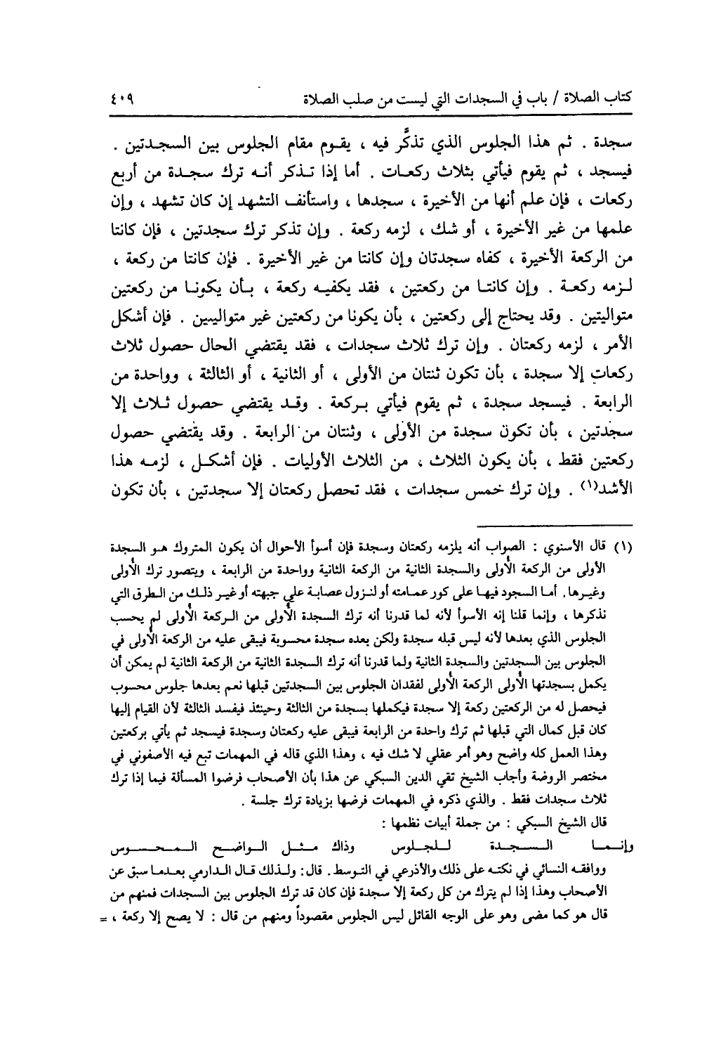 سجدة. ثم هذا الجلوس الذي تذكر فيه، يقوم مقام الجلوس بين السجدتين. فيسجد، ثم يقوم فيأتي بثلاث ركعات. أما إذا تذكر أنه ترك سجدة من أربع ركعات، فإن علم أنها من الاخيرة، سجدها، واستأنف التشهد إن كان تشهد، وإن علمها من غير الاخيرة، أو شك، لزمه ركعة. وإن تذكر ترك سجدتين، فإن كانتا من الركعة الاخيرة، كفاه سجدتان وإن كانتا من غير الاخيرة. فإن كانتا من ركعة، لزمه ركعة. وإن كانتا من ركعتين، فقد يكفيه ركعة، بأن يكونا من ركعتين متواليتين. وقد يحتاج إلى ركعتين، بأن يكونا من ركعتين غير متواليتين. فإن أشكل الامر، لزمه ركعتان. وإن ترك ثلاث سجدات، فقد يقتضي الحال حصول ثلاث ركعات إلا سجدة، بأن تكون ثنتان من الاولى، أو الثانية، أو الثالثة، وواحدة من الرابعة. فيسجد سجدة، ثم يقوم فيأتي بركعة. وقد يقتضي حصول ثلاث إلا سجدتين، بأن تكون سجدة من الاولى، وثنتان من الرابعة. وقد يقتضي حصول ركعتين فقط، بأن يكون الثلاث، من الثلاث الاوليات. فإن أشكل، لزمه هذا الاشد (1). وإن ترك خمس سجدات، فقد تحصل ركعتان إلا سجدتين بأن تكون