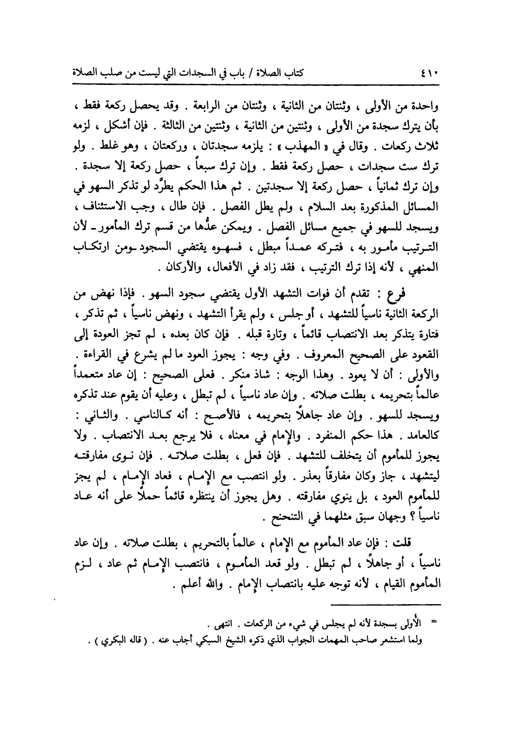واحدة من الاولى، وثنتان من الثانية، وثنتان من الرابعة. وقد يحصل ركعة فقط بأن يترك سجدة من الاولى، وثنتين من الثانية، وثنتين من الثالثة. فإن أشكل، لزمه ثلاث ركعات. وقال في (المهذب): يلزمه سجدتان، وركعتان، وهو غلط. ولو ترك ست سجدات، حصل ركعة فقط. وإن ترك سبعا، حصل ركعة إلا سجدة. وإن ترك ثمانيا، حصل ركعة إلا سجدتين. ثم هذا الحكم يطرد لو تذكر السهو في المسائل المذكورة بعد السلام، ولم يطل الفصل. فإن طال، وجب الاستئناف، ويسجد للسهو في جميع مسائل الفصل. ويمكن عدها من قسم ترك المأمور - لان الترتيب مأمور به، فتركه عمدا مبطل، فسهوه يقتضي السجود - ومن ارتكاب المنهي، لانه إذا ترك الترتيب، فقد زاد في الافعال، والاركان. فرع: تقدم أن فوات التشهد الاول يقتضي سجود السهو. فإذا نهض من الركعة الثانية ناسيا للتشهد، أو جلس، ولم يقرأ التشهد، ونهض ناسيا، ثم تذكر، فتارة يتذكر بعد الانتصاب قائما، وتارة قبله. فإن كان بعده، لم تجز العودة إلى القعود على الصحيح المعروف. وفي وجه: يجوز العود ما لم يشرع في القراءة. والاولى: أن لا يعود. وهذا الوجه: شاذ منكر. فعلى الصحيح: إن عاد متعمدا عالما بتحريمه، بطلت صلاته. وإن عاد ناسيا، لم تبطل، وعليه أن يقوم عند تذكره ويسجد للسهو. وإن عاد جاهلا بتحريمه، فالاصح: أنه كالناسي. والثاني: كالعامد. هذا حكم المنفرد. والامام في معناه، فلا يرجع بعد الانتصاب. ولا يجوز للمأموم أن يتخلف للتشهد. فإن فعل، بطلت صلاته. فإن نوى مفارقته ليتشهد، جاز وكان مفارقا بعذر. ولو انتصب مع الامام، فعاد الامام، لم يجز للمأموم العود، بل ينوي مفارقته. وهل يجوز أن ينتظره قائما حملا على أنه عاد ناسيا ؟ وجهان سبق مثلهما في التنحنح. قلت: فإن عاد المأموم مع الامام، عالما بالتحريم، بطلت صلاته. وإن عاد ناسيا، أو جاهلا، لم تبطل. ولو قعد المأموم، فانتصب الامام ثم عاد، لزم المأموم القيام، لانه توجه عليه بانتصاب الامام. والله أعلم.
