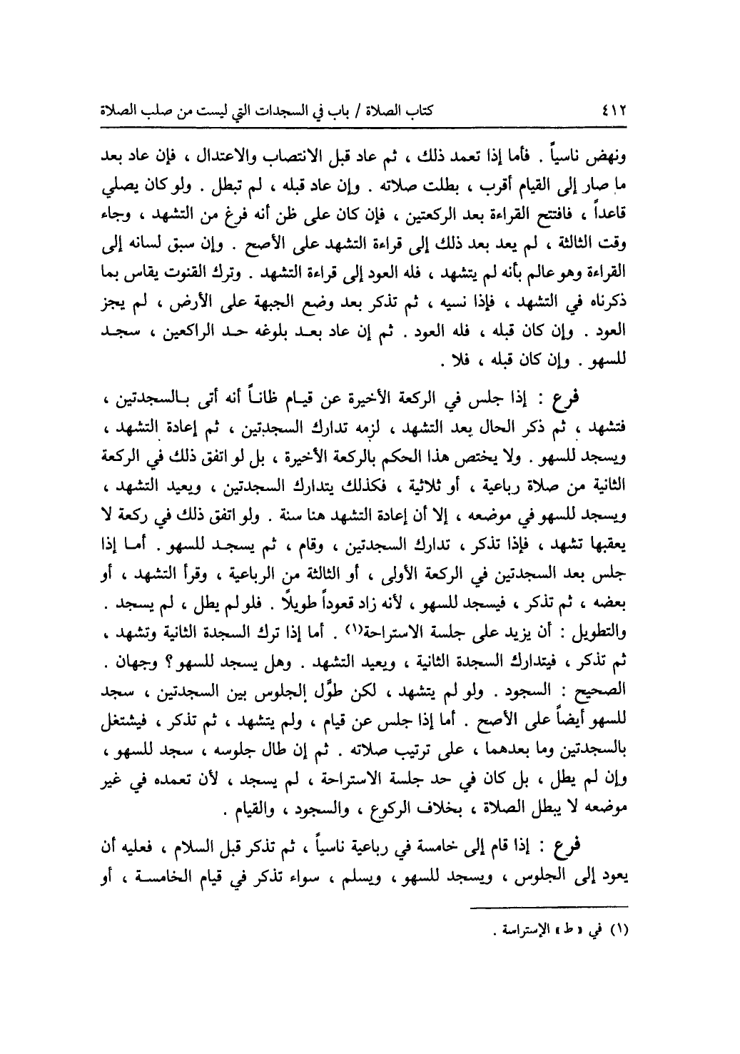 ونهض ناسيا. فأما إذا تعمد ذلك، ثم عاد قبل الانتصاب والاعتدال، فإن عاد بعد ما صار إلى القيام أقرب، بطلت صلاته. وإن عاد قبله، لم تبطل. ولو كان يصلي قاعدا، فافتتح القراءة بعد الركعتين، فإن كان على ظن أنه فرغ من التشهد، وجاء وقت الثالثة، لم يعد بعد ذلك إلى قراءة التشهد على الاصح. وإن سبق لسانه إلى القراءة وهو عالم بأنه لم يتشهد، فله العود إلى قراءة التشهد. وترك القنوت يقاس بما ذكرناه في التشهد، فإذا نسيه، ثم تذكر بعد وضع الجبهة على الارض، لم يجز العود. وإن كان قبله، فله العود. ثم إن عاد بعد بلوغه حد الراكعين، سجد للسهو. وإن كان قبله، فلا. فرع: إذا جلس في الركعة الاخيرة عن قيام ظانا أنه أتى بالسجدتين، فتشهد، ثم ذكر الحال بعد التشهد، لزمه تدارك السجدتين، ثم إعادة التشهد، ويسجد للسهو. ولا يختص هذا الحكم بالركعة الاخيرة، بل لو اتفق ذلك في الركعة الثانية من صلاة رباعية، أو ثلاثية، فكذلك يتدارك السجدتين، ويعيد التشهد، ويسجد للسهو في موضعه، إلا أن إعادة التشهد هنا سنة. ولو اتفق ذلك في ركعة لا يعقبها تشهد، فإذا تذكر، تدارك السجدتين، وقام، ثم يسجد للسهو. أما إذا جلس بعد السجدتين في الركعة الاولى، أو الثالثة من الرباعية، وقرأ التشهد، أو بعضه، ثم تذكر، فيسجد للسهو، لانه زاد قعودا طويلا. فلو لم يطل، لم يسجد. والتطويل: أن يزيد على جلسة الاستراحة (1). أما إذا ترك السجدة الثانية وتشهد، ثم تذكر، فيتدارك السجدة الثانية، ويعيد التشهد. وهل يسجد للسهو ؟ وجهان. الصحيح: السجود. ولو لم يتشهد، لكن طول الجلوس بين السجدتين، سجد للسهو أيضا على الاصح. أما إذا جلس عن قيام، ولم يتشهد، ثم تذكر، فيشتغل بالسجدتين وما بعدهما، على ترتيب صلاته. ثم إن طال جلوسه، سجد للسهو. وإن لم يطل، بل كان في حد جلسة الاستراحة، لم يسجد، لان تعمده في غير موضعه لا يبطل الصلاة، بخلاف الركوع، والسجود، والقيام. فرع: إذا قام إلى خامسة في رباعية ناسيا، ثم تذكر قبل السلام، فعليه أن يعود إلى الجلوس، ويسجد للسهو، ويسلم، سواء تذكر في قيام الخامسة، أو