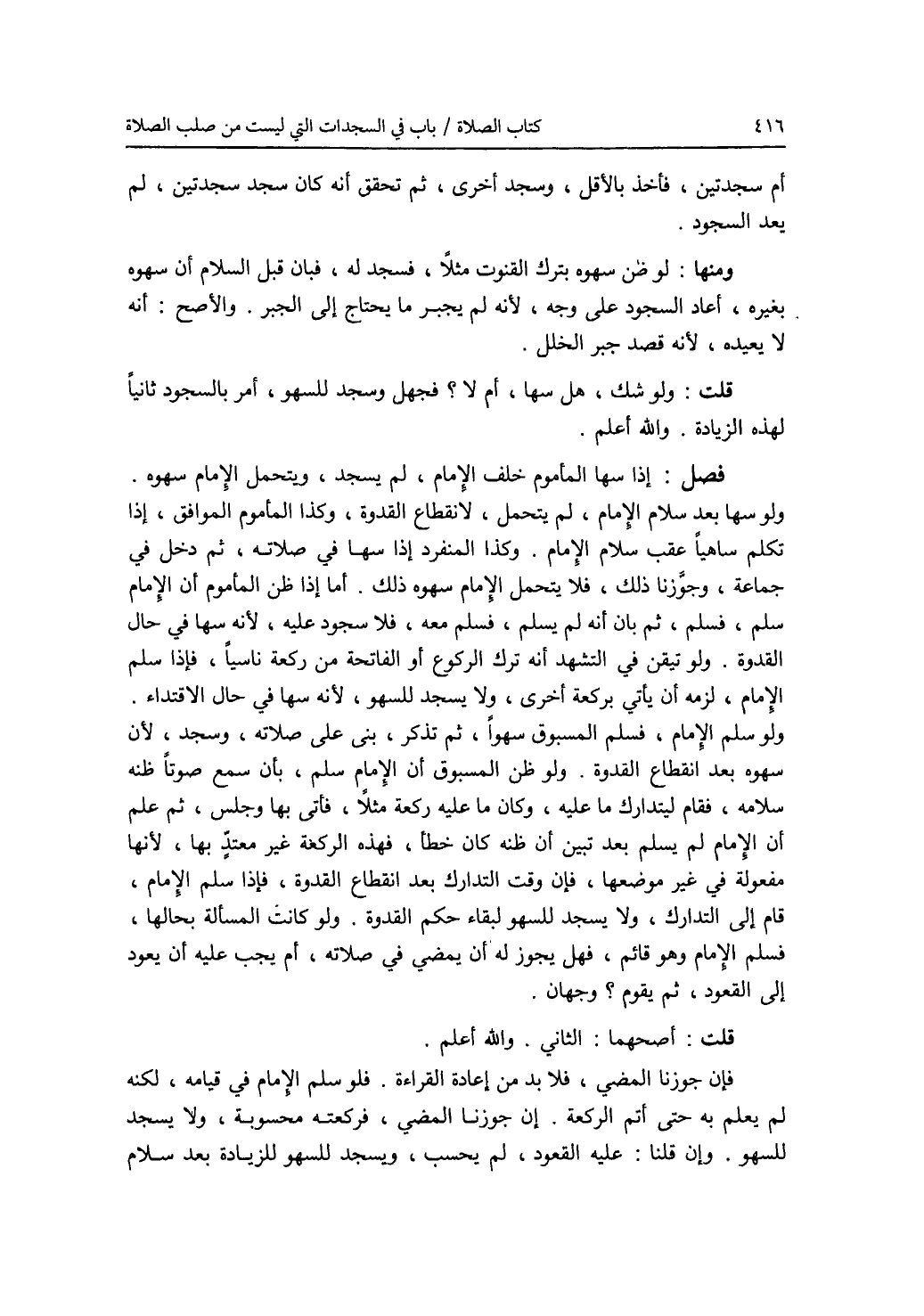 أم سجدتين، فأخذ بالاقل، وسجد أخرى، ثم تحقق أنه كان سجد سجدتين، لم يعد السجود. ومنها: لو ظن سهوه بترك القنوت مثلا، فسجد له، فبان قبل السلام أن سهوه بغيره، أعاد السجود على وجه، لانه لم يجبر ما يحتاج إلى الجبر. والاصح: أنه لا يعيده، لانه قصد جبر الخلل. قلت: ولو شك، هل سها، أم لا ؟ فجهل وسجد للسهو، أمر بالسجود ثانيا لهذه الزيادة. والله أعلم. فصل: إذا سها المأموم خلف الامام، لم يسجد، ويتحمل الامام سهوه. ولو سها بعد سلام الامام، لم يتحمل، لانقطاع القدوة، وكذا المأموم الموافق، إذا تكلم ساهيا عقب سلام الامام. وكذا المنفرد إذا سها في صلاته، ثم دخل في جماعة، وجوزنا ذلك، فلا يتحمل الامام سهوه ذلك. أما إذا ظن المأموم أن الامام سلم، فسلم، ثم بان أنه لم يسلم، فسلم معه، فلا سجود عليه، لانه سها في حال القدوة. ولو تيقن في التشهد أنه ترك الركوع أو الفاتحة من ركعة ناسيا، فإذا سلم الامام، لزمه أن يأتي بركعة أخرى، ولا يسجد للسهو، لانه سها في حال الاقتداء. ولو سلم الامام، فسلم المسبوق سهوا، ثم تذكر، بنى على صلاته، وسجد، لان سهوه بعد انقطاع القدوة. ولو ظن المسبوق أن الامام سلم، بأن سمع صوتا ظنه سلامه، فقام ليتدارك ما عليه، وكان ما عليه ركعة مثلا، فأتى بها وجلس، ثم علم أن الامام لم يسلم بعد تبين أن ظنه كان خطأ، فهذه الركعة غير معتد بها. لانها مفعولة في غير موضعها، فإن وقت التدارك بعد انقطاع القدوة، فإذا سلم الامام، قام إلى التدارك، ولا يسجد للسهو لبقاء حكم القدوة. ولو كانت المسألة بحالها، فسلم الامام وهو قائم، فهل يجوز له أن يمضي في صلاته، أم يجب عليه أن يعود إلى القعود، ثم يقوم ؟ وجهان. قلت: أصحهما: الثاني. والله أعلم. فإن جوزنا المضي، فلا بد من إعادة القراءة. فلو سلم الامام في قيامه، لكنه لم يعلم به حتى أتم الركعة. إن جوزنا المضي، فركعته محسوبة، ولا يسجد للسهو. وإن قلنا: عليه القعود، لم يحسب، ويسجد للسهو للزيادة بعد سلام