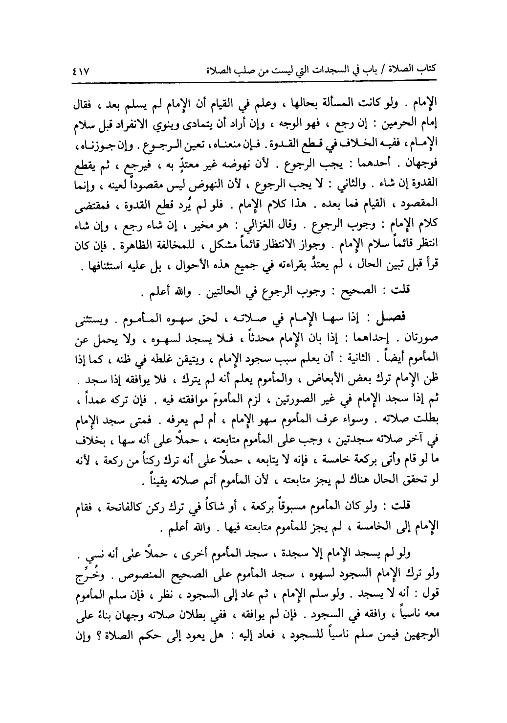 الامام. ولو كانت المسألة بحالها، وعلم في القيام أن الامام لم يسلم بعد، فقال إمام الحرمين: إن رجع، فهو الوجه، وإن أراد أن يتمادى وينوي الانفراد قبل سلام الامام، ففيه الخلاف في قطع القدوة. فإن منعناه، تعين الرجوع. وإن جوزناه، فوجهان. أحدهما: يجب الرجوع. لان نهوضه غير معتد به، فيرجع، ثم يقطع القدوة إن شاء. والثاني: لا يجب الرجوع، لان النهوض ليس مقصودا لعينه، وإنما المقصود، القيام فما بعده. هذا كلام الامام. فلو لم يرد قطع القدوة، فمقتضى كلام الامام: وجوب الرجوع. وقال الغزالي: هو مخير، إن شاء رجع، وإن شاء انتظر قائما سلام الامام. وجواز الانتظار قائما مشكل، للمخالفة الظاهرة. فإن كان قرأ قبل تبين الحال، لم يعتد بقراءته في جميع هذه الاحوال، بل عليه استئنافها. قلت: الصحيح: وجوب الرجوع في الحالتين. والله أعلم. فصل: إذا سها الامام في صلاته، لحق سهوه المأموم ويستثنى صورتان. إحداهما: إذا بان الامام محدثا، فلا يسجد لسهوه، ولا يتحمل عن المأموم أيضا. الثانية: أن يعلم سبب سجود الامام، ويتيقن غلطه في ظنه، كما إذا ظن الامام ترك بعض الابعاض، والمأموم يعلم أنه لم يترك، فلا يوافقه إذا سجد. ثم إذا سجد الامام في غير الصورتين، لزم المأموم موافقته فيه. فإن تركه عمدا، بطلت صلاته. وسواء عرف المأموم سهو الامام، أم لم يعرفه. فمتى سجد الامام في آخر صلاته سجدتين، وجب على المأموم متابعته، حملا على أنه سها، بخلاف ما لو قام وأتى بركعة خامسة، فإنه لا يتابعه، حملا على أنه ترك ركنا من ركعة، لانه لو تحقق الحال هناك لم يجز متابعته، لان المأموم أتم صلاته يقينا. قلت: ولو كان المأموم مسبوقا بركعة، أو شاكا في ترك ركن كالفاتحة، فقام الامام إلى الخامسة، لم يجز للمأموم متابعته فيها. والله أعلم. ولو لم يسجد الامام إلا سجدة، سجد المأموم أخرى، حملا على أنه نسي. ولو ترك الامام السجود لسهوه، سجد المأموم على الصحيح المنصوص. وخرج قول: أنه لا يسجد. ولو سلم الامام، ثم عاد إلى السجود، نظر، فإن سلم المأموم معه ناسيا، وافقه في السجود. فإن لم يوافقه، ففي بطلان صلاته وجهان بناء على الوجهين فيمن سلم ناسيا للسجود فعاد إليه: هل يعود إلى حكم الصلاة ؟ وإن