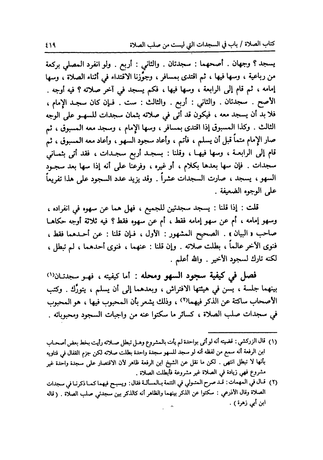 يسجد ؟ وجهان. أصحهما: سجدتان. والثاني: أربع. ولو انفرد المصلي بركعة من رباعية، وسها فيها، ثم اقتدى بمسافر، وجوزنا الاقتداء في أثناء الصلاة، وسها إمامه، ثم قام إلى الرابعة، وسها فيها، فكم يسجد في آخر صلاته ؟ فيه أوجه. الاصح. سجدتان. والثاني: أربع. والثالث: ست. فإن كان سجد الامام، فلا بد أن يسجد معه، فيكون قد أتى في صلاته بثمان سجدات للسهو على الوجه الثالث. وكذا المسبوق إذا اقتدى بمسافر، وسها الامام، وسجد معه المسبوق، ثم صار الامام متما قبل أن يسلم، فأتم، وأعاد سجود السهو، وأعاد معه المسبوق، ثم قام إلى الرابعة، وسها فيها، وقلنا: يسجد أربع سجدات، فقد أتى بثماني سجدات. فإن سها بعدها بكلام، أو غيره، وفرعنا على أنه إذا سها بعد سجود السهو، يسجد، صارت السجدات عشرا. وقد يزيد عدد السجود على هذا تفريعا على الوجوه الضعيفة. قلت: إذا قلنا: يسجد سجدتين للجميع، فهل هما عن سهوه في انفراده، وسهو إمامه أم عن سهو إمامه فقط، أم عن سهوه فقط ؟ فيه ثلاثة أوجه حكاها صاحب (البيان). الصحيح المشهور: الاول، فإن قلنا: عن أحدهما فقط، فنوى الآخر عالما، بطلت صلاته. وإن قلنا: عنهما، فنوى أحدهما، لم تبطل، لكنه تارك لسجود الاخير. والله أعلم. فصل في كيفية سجود السهو ومحله: أما كيفيته، فهو سجدتان (1) بينهما جلسة، يسن في هيئتها الافتراش، وبعدهما إلى أن يسلم، يتورك. وكتب الاصحاب ساكتة عن الذكر فيهما (2)، وذلك يشعر بأن المحبوب فيها، هو المحبوب في سجدات صلب الصلاة، كسائر ما سكتوا عنه من واجبات السجود ومحبوباته.