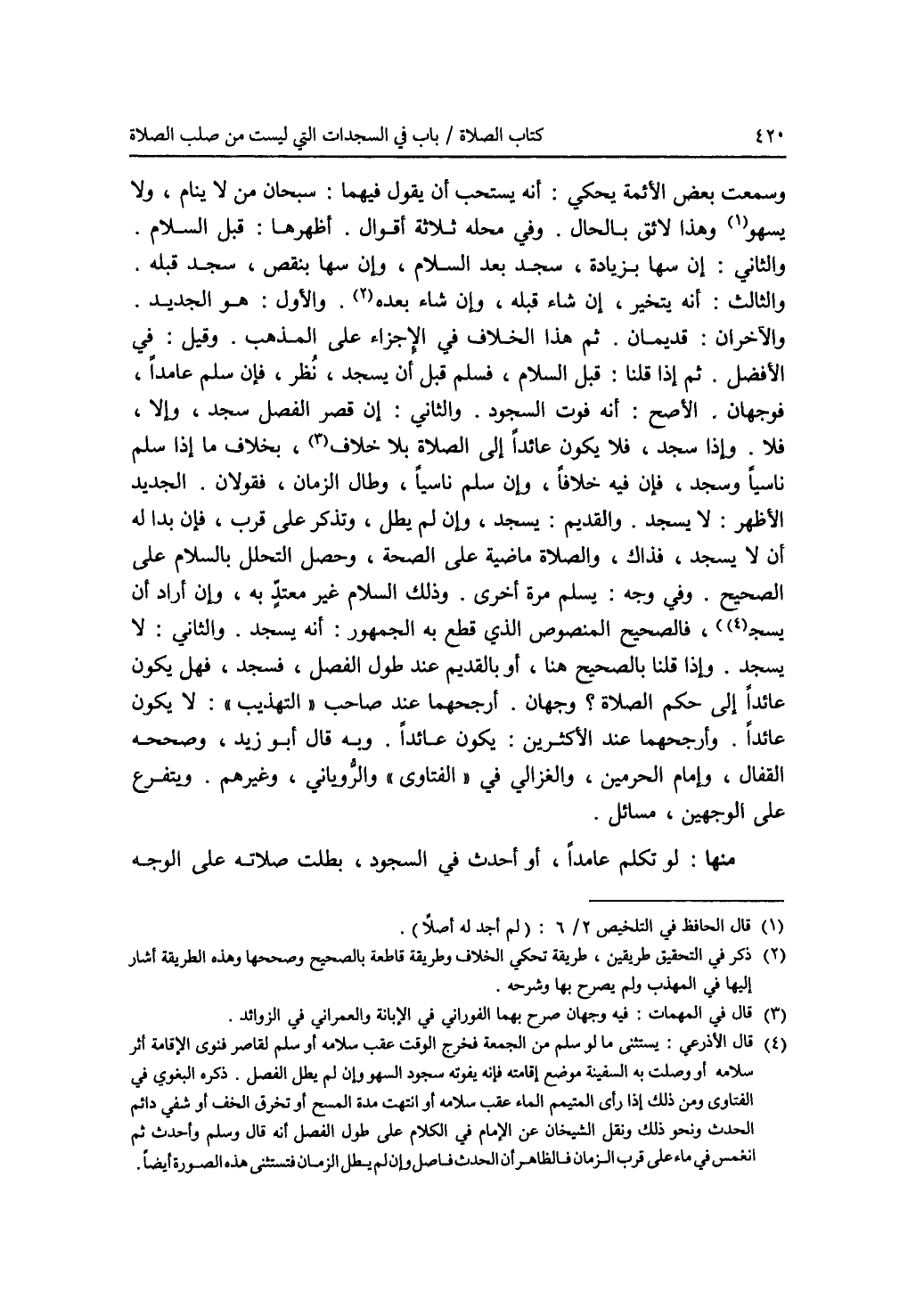 وسمعت بعض الائمة يحكي: أنه يستحب أن يقول فيهما: سبحان من لا ينام، ولا يسهو (1). وهذا لائق بالحال. وفي محله ثلاثة أقوال. أظهرها: قبل السلام. والثاني: إن سها بزيادة، سجد بعد السلام، وإن سها بنقص، سجد قبله. والثالث: أنه يتخير، إن شاء قبله، وإن شاء بعده (2). والاول: هو الجديد. والآخران: قديمان. ثم هذا الخلاف في الاجزاء على المذهب. وقيل: في الافضل. ثم إذا قلنا: قبل السلام، فسلم قبل أن يسجد، نظر، فإن سلم عامدا، فوجهان. الاصح: أنه فوت السجود. والثاني: إن قصر الفصل سجد، وإلا، فلا. وإذا سجد، فلا يكون عائدا إلى الصلاة بلا خلاف (3)، بخلاف ما إذا سلم ناسيا وسجد، فإن فيه خلافا، وإن سلم ناسيا، وطال الزمان، فقولان. الجديد الاظهر: لا يسجد. والقديم: يسجد، وإن لم يطل، وتذكر على قرب، فإن بدا له أن لا يسجد، فذاك، والصلاة ماضية على الصحة، وحصل التحلل بالسلام على الصحيح. وفي وجه: يسلم مرة أخرى. وذلك السلام غير معتد به، وإن أراد أن يسجد (4)، فالصحيح المنصوص الذي قطع به الجمهور: أنه يسجد. والثاني: لا يسجد. وإذا قلنا بالصحيح هنا، أو بالقديم عند طول الفصل، فسجد، فهل يكون عائدا إلى حكم الصلاة ؟ وجهان. أرجحهما عند صاحب (التهذيب): لا يكون عائدا. وأرجحهما عند الاكثرين: يكون عائدا. وبه قال أبو زيد، وصححه القفال، وإمام الحرمين، والغزالي في (الفتاوى) والروياني، وغيرهم. ويتفرع على الوجهين، مسائل. منها: لو تكلم عامدا، أو أحدث في السجود، بطلت صلاته على الوجه