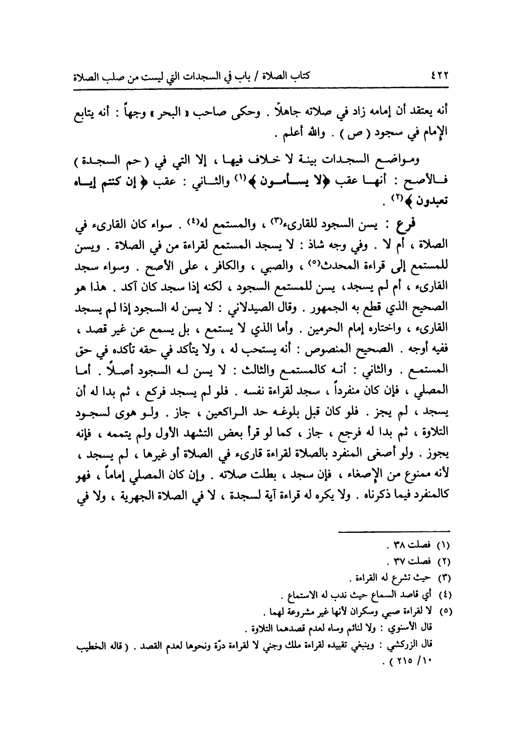 أنه يعتقد أن إمامه زاد في صلاته جاهلا. وحكى صاحب (البحر) وجها: أنه يتابع الامام في سجود - صلى الله عليه وسلم -. والله أعلم. ومواضع السجدات بينة لا خلاف فيها، إلا التي في (حم السجدة) فالاصح: أنها عقب * (لا يسأمون) (1) *. والثاني: عقب * (إن كنتم إياه تعبدون) (2) *. فرع: يسن السجود للقارئ (3)، والمستمع له (4)، سواء كان القارئ في الصلاة، أم لا. وفي وجه شاذ: لا يسجد المستمع لقراءة من في الصلاة. ويسن للمستمع إلى قراءة المحدث (5)، والصبي، والكافر، على الاصح. وسواء سجد القارئ، أم لم يسجد، يسن للمستمع السجود، لكنه إذا سجد كان آكد. هذا هو الصحيح الذي قطع به الجمهور. وقال الصيدلاني: لا يسن له السجود إذا لم يسجد القارئ، واختاره إمام الحرمين. وأما الذي لا يستمع، بل يسمع عن غير قصد، ففيه أوجه. الصحيح المنصوص: أنه يستحب له، ولا يتأكد في حقه تأكده في حق المستمع. والثاني: أنه كالمستمع. والثالث: لا يسن له السجود أصلا. أما المصلي، فإن كان منفردا سجد لقراءة نفسه. فلو لم يسجد فركع، ثم بدا له أن يسجد، لم يجز. فلو كان قبل بلوغه حد الراكعين، جاز. ولو هوى لسجود التلاوة، ثم بدا له فرجع، جاز، كما لو قرأ بعض التشهد الاول ولم يتممه، فإنه يجوز. ولو أصغى المنفرد بالصلاة لقراءة قارئ في الصلاة أو غيرها، لم يسجد، لانه ممنوع من الاصغاء، فإن سجد، بطلت صلاته. وإن كان المصلي إماما، فهو كالمنفرد فيما ذكرناه. ولا يكره له قراءة آية لسجدة، لا في الصلاة الجهرية، ولا في