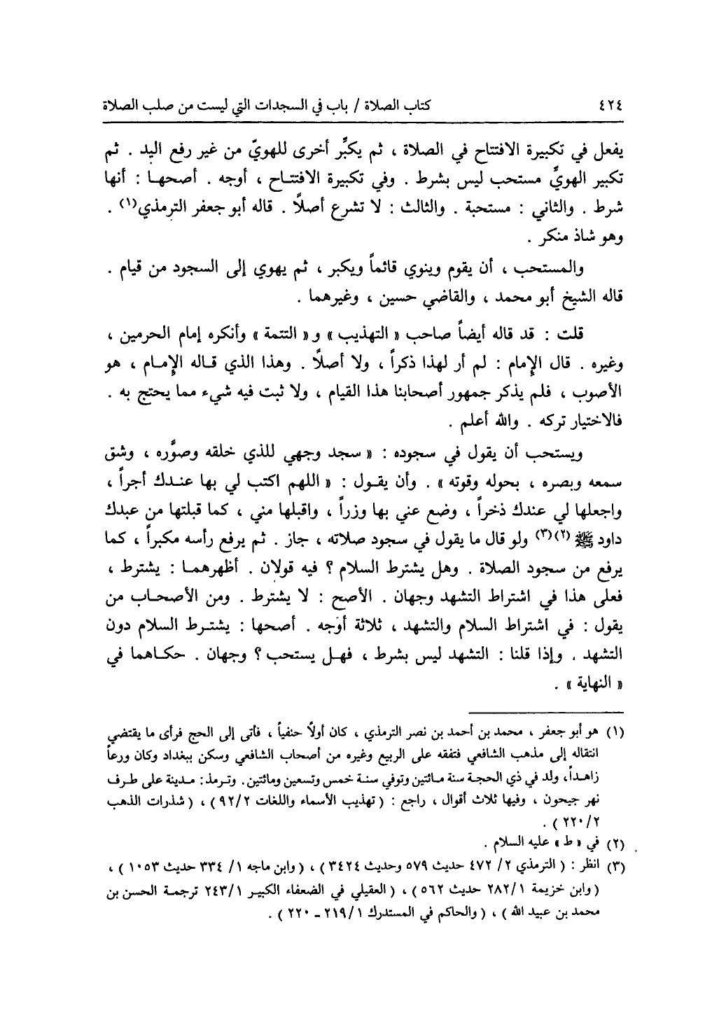 يفعل في تكبيرة الافتتاح في الصلاة، ثم يكبر أخرى للهوي من غير رفع اليد. ثم تكبير الهوي مستحب ليس بشرط. وفي تكبيرة الافتتاح، أوجه. أصحها: أنها شرط. والثاني: مستحبة. والثالث: لا تشرع أصلا. قاله أبو جعفر الترمذي (1). وهو شاذ منكر. قلت: قد قاله أيضا صاحب (التهذيب) و (التتمة) وأنكره إمام الحرمين، وغيره. قال الامام: ولم أر لهذا ذكرا، ولا أصلا. وهذا الذي قاله الامام، هو الاصوب، فلم يذكر جمهور أصحابنا هذا القيام، ولا ثبت فيه شئ مما يحتج به. فالاختيار تركه. والله أعلم. ويستحب أن يقول في سجوده: (سجد وجهي للذي خلقه وصوره، وشق سمعه وبصره، بحوله وقوته). وأن يقول: (اللهم اكتب لي بها عندك أجرا، واجعلها لي عندك ذخرا، وضع عني بها وزرا، واقبلها مني، كما قبلتها من عبدك داود - صلى الله عليه وسلم - (2) (3) ولو قال ما يقول في سجود صلاته، جاز. ثم يرفع رأسه مكبرا، كما يرفع من سجود الصلاة. وهل يشترط السلام ؟ فيه قولان. أظهرهما: يشترط، فعلى هذا في اشتراط التشهد وجهان. الاصح: لا يشترط. ومن الاصحاب من يقول: في اشتراط السلام والتشهد، ثلاثة أوجه. أصحها: يشترط السلام دون التشهد. وإذا قلنا: التشهد ليس بشرط، فهل يستحب ؟ وجهان. حكاهما في (النهاية).