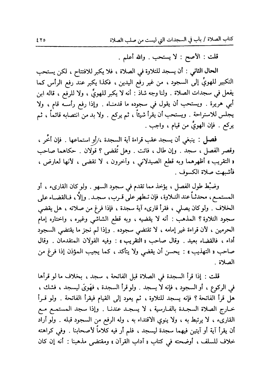 قلت: الاصح: لا يستحب. والله أعلم. الحال الثاني: أن يسجد للتلاوة في الصلاة، فلا يكبر للافتتاح، لكن يستحب التكبير للهوي إلى السجود، من غير رفع اليدين، فكذا يكبر عند رفع الرأس كما يفعل في سجدات الصلاة. ولنا وجه شاذ: أنه لا يكبر للهوي، ولا للرفع، قاله ابن أبي هريرة. ويستحب أن يقول في سجوده ما قدمناه. وإذا رفع رأسه قام، ولا يجلس للاستراحة. ويستحب أن يقرأ شيئا، ثم يركع. ولا بد من انتصابه قائما، ثم يركع. فإن الهوي من قيام، واجب. فصل: ينبغي أن يسجد عقب قراءة آية سجدة، أو استماعها. فإن أخر، وقصر الفصل، سجد. وإن طال، فاتت. وهل تقضى ؟ قولان. حكاهما صاحب (التقريب) أظهرهما - وبه قطع الصيدلاني، وآخرون: لا تقضى، لانها لعارض، فأشبهت صلاة الكسوف. وضبط طول الفصل، يؤخذ مما تقدم في سجود السهو. ولو كان القارئ، أو المستمع، محدثا عند التلاوة فإن تطهر على قرب، سجد. وإلا، فالقضاء على الخلاف. ولو كان يصلي، فقرأ قارئ آية سجدة، فإذا فرغ من صلاته، هل يقضي سجود التلاوة ؟ المذهب: أنه لا يقضيه، وبه قطع الشاشي وغيره، واختاره إمام الحرمين، لان قراءة غير إمامه، لا تقتضي سجوده. وإذا لم نجز ما يقتضي السجود أداء، فالقضاء بعيد. وقال صاحب (التقريب): وفيه القولان المتقدمان. وقال صاحب (التهذيب): يحسن أن يقضي ولا يتأكد، كما يجيب المؤذن إذا فرغ من الصلاة. قلت: إذا قرأ السجدة في الصلاة قبل الفاتحة، سجد، بخلاف ما لو قرأها في الركوع، أو السجود، فإنه لا يسجد. ولو قرأ السجدة، فهوى ليسجد، فشك، هل قرأ الفاتحة ؟ فإنه يسجد للتلاوة، ثم يعود إلى القيام، فيقرأ الفاتحة. ولو قرأ خارج الصلاة السجدة بالفارسية، لا يسجد عندنا. وإذا سجد المستمع مع القارئ، لا يرتبط به، ولا ينوي الاقتداء به، وله الرفع من السجود قبله. ولو أراد أن يقرأ آية، أو آيتين فيهما سجدة، ليسجد، فلم أر فيه كلاما لاصحابنا. وفي كراهته خلاف للسلف، أوضحته في كتاب (آداب القرآن) ومقتضى مذهبنا: أنه إن كان