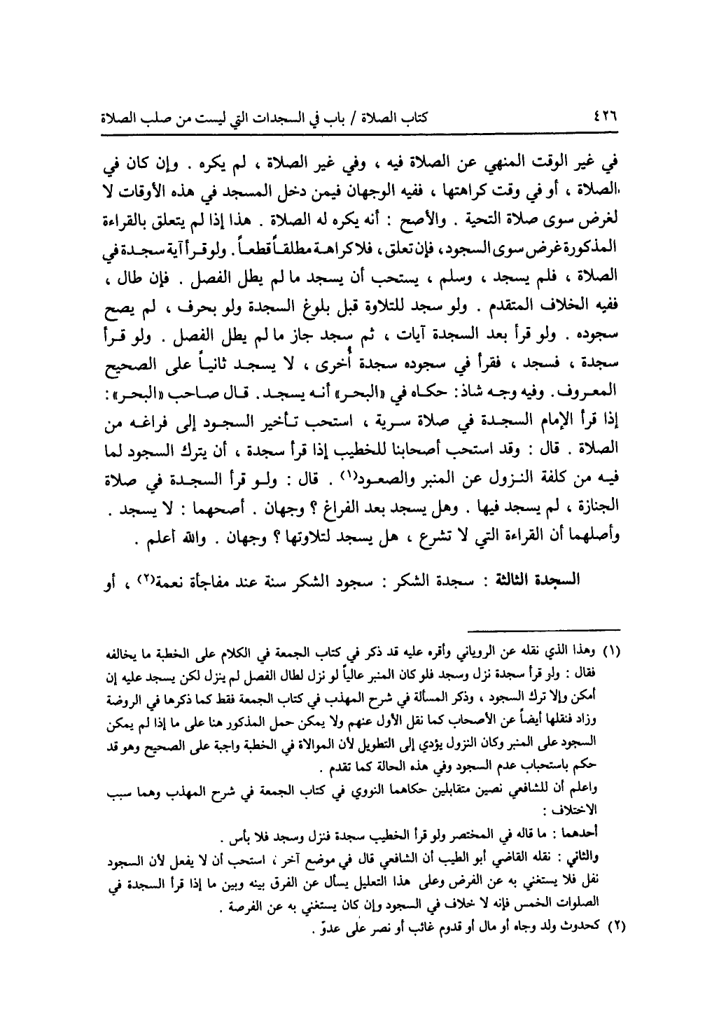 في غير الوقت المنهي عن الصلاة فيه، وفي غير الصلاة، لم يكره. وإن كان في الصلاة، أو في وقت كراهتها، ففيه الوجهان فيمن دخل المسجد في هذه الاوقات لا لغرض سوى صلاة التحية. والاصح: أنه يكره له الصلاة. هذا إذا لم يتعلق بالقراءة المذكورة غرض سوى السجود، فإن تعلق، فلا كراهة مطلقا قطعا، ولو قرأ آية سجدة في الصلاة، فلم يسجد، وسلم، يستحب أن يسجد ما لم يطل الفصل. فإن طال، ففيه الخلاف المتقدم. ولو سجد للتلاوة قبل بلوغ السجدة ولو بحرف، لم يصح سجوده. ولو قرأ بعد السجدة آيات، ثم سجد جاز ما لم يطل الفصل. ولو قرأ سجدة، فسجد، فقرأ في سجوده سجدة أخرى، لا يسجد ثانيا على الصحيح المعروف. وفيه وجه شاذ: حكاه في (البحر) أنه يسجد. قال صاحب (البحر): إذا قرأ الامام السجدة في صلاة سرية، استحب تأخير السجود إلى فراغه من الصلاة. قال: وقد استحب أصحابنا للخطيب إذا قرأ سجدة، أن يترك السجود لما فيه من كلفة النزول عن المنبر والصعود (1). قال: ولو قرأ السجدة في صلاة الجنازة، لم يسجد فيها. وهل يسجد بعد الفراغ ؟ وجهان. أصحهما: لا يسجد. وأصلهما أن القراءة التي لا تشرع، هل يسجد لتلاوتها ؟ وجهان. والله أعلم. السجدة الثالثة: سجدة الشكر: سجود الشكر سنة عند مفاجأة نعمة (2)، أو