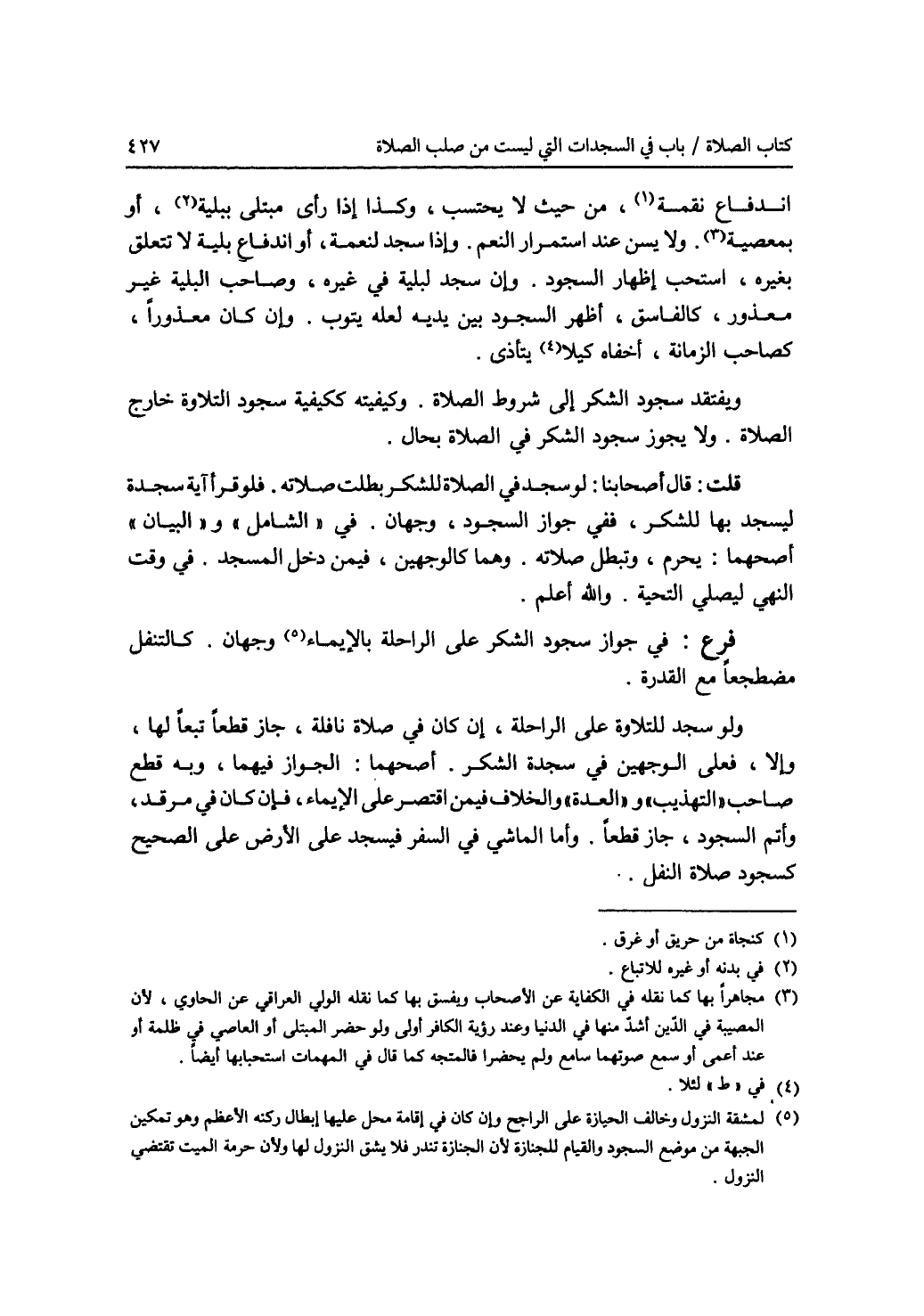 اندفاع نقمة (1)، من حيث لا يحتسب، وكذا إذا رأى مبتلى ببلية (2)، أو بمعصية (3). ولا يسن عند استمرار النعم. وإذا سجد لنعمة، أو اندفاع بلية لا تتعلق بغيره، استحب إظهار السجود. وإن سجد لبلية في غيره، وصاحب البلية غير معذور، كالفاسق، أظهر السجود بين يديه لعله يتوب. وإن كان معذورا، كصاحب الزمانة، أخفاه كيلا (4) يتأذى. ويفتقد سجود الشكر إلى شروط الصلاة. وكيفيته ككيفية سجود التلاوة خارج الصلاة. ولا يجوز سجود الشكر في الصلاة بحال. قلت: قال أصحابنا: لو سجد في الصلاة للشكر، بطلت صلاته. فلو قرأ آية سجدة ليسجد بها للشكر، ففي جواز السجود، وجهان. في (الشامل) و (البيان) أصحهما: يحرم، وتبطل صلاته. وهما كالوجهين، فيمن دخل المسجد في وقت النهي ليصلي التحية. والله أعلم. فرع: في جواز سجود الشكر على الراحلة بالايماء (5) وجهان. كالتنفل مضطجعا مع القدرة. ولو سجد للتلاوة على الراحلة، إن كان في صلاة نافلة، جاز قطعا تبعا لها، وإلا، فعلى الوجهين في سجدة الشكر. أصحهما: الجواز فيهما، وبه قطع صاحب (التهذيب) و (العدة) والخلاف فيمن اقتصر على الايماء، فإن كان في مرقد، وأتم السجود، جاز قطعا. وأما الماشي في السفر فيسجد على الارض على الصحيح