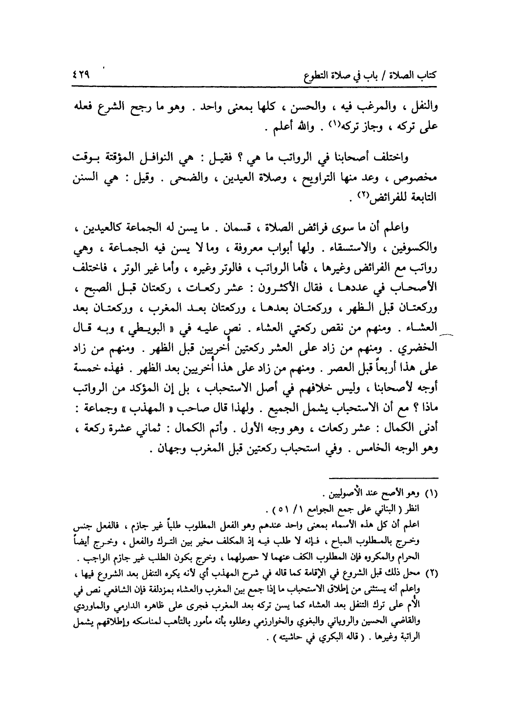 والنفل والمرغب فيه، والحسن، كلها بمعنى واحد. وهو ما رجح الشرع فعله على تركه، وجاز تركه (1). والله أعلم. واختلف أصحابنا في الرواتب ما هي ؟ فقيل: هي النوافل الموقتة بوقت مخصوص، وعد منها التراويح، وصلاة العيدين، والضحى. وقيل: هي السنن التابعة للفرائض (2). واعلم أن ما سوى فرائض الصلاة، قسمان. ما يسن له الجماعة كالعيدين، والكسوفين، والاستسقاء. ولها أبواب معروفة، وما لا يسن فيه الجماعة، وهي رواتب مع الفرائض وغيرها، فأما الرواتب، فالوتر وغيره، وأما غير الوتر، فاختلف الاصحاب في عددها، فقال الاكثرون: عشر ركعات، ركعتان قبل الصبح، وركعتان قبل الظهر، وركعتان بعدها، وركعتان بعد المغرب، وركعتان بعد العشاء. ومنهم من نقص ركعتي العشاء. نص عليه في (البويطي) وبه قال الخضري. ومنهم من زاد على العشر ركعتين أخريين قبل الظهر. ومنهم من زاد على هذا أربعا قبل العصر. ومنهم من زاد على هذا آخريين بعد الظهر. فهذه خمسة أوجه لاصحابنا، وليس خلافهم في أصل الاستحباب، بل إن المؤكد من الرواتب ماذا ؟ مع أن الاستحباب يشمل الجميع. ولهذا قال صاحب (المهذب) وجماعة: أدنى الكمال: عشر ركعات، وهو وجه الاول. وأتم الكمال: ثماني عشرة ركعة، وهو الوجه الخامس. وفي استحباب ركعتين قبل المغرب وجهان.