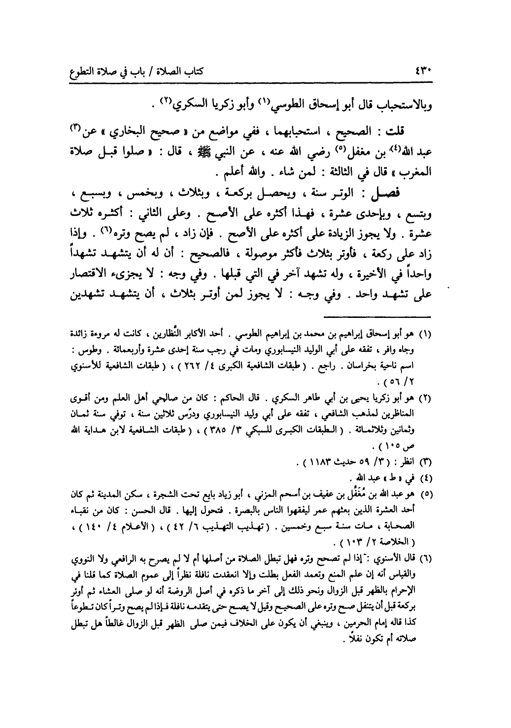 وبالاستحباب قال أبو إسحاق الطوسي (1)، وأبو زكريا السكري (2). قلت: الصحيح، استحبابهما، ففي مواضع من (صحيح البخاري) عن (3) عبد الله (4) بن مغفل (5) رضي الله عنه، عن النبي - صلى الله عليه وسلم - قال: (صلوا قبل صلاة المغرب) قال في الثالثة: لمن شاء. والله أعلم. فصل: الوتر سنة. ويحصل بركعة، وبثلاث، وبخمس، وبسبع، وبتسع، وبإحدى عشرة، فهذا أكثره على الاصح. وعلى الثاني: أكثره ثلاث عشرة. ولا يجوز الزيادة على أكثره على الاصح. فإن زاد، لم يصح وتره (6). وإذا زاد على ركعة، فأوتر بثلاث فأكثر موصولة، فالصحيح: أن له أن يتشهد تشهدا واحدا في الاخيرة، وله تشهد آخر في التي قبلها. وفي وجه: لا يجزئ الاقتصار على تشهد واحد. وفي وجه: لا يجوز لمن أوتر بثلاث، أن يتشهد تشهدين