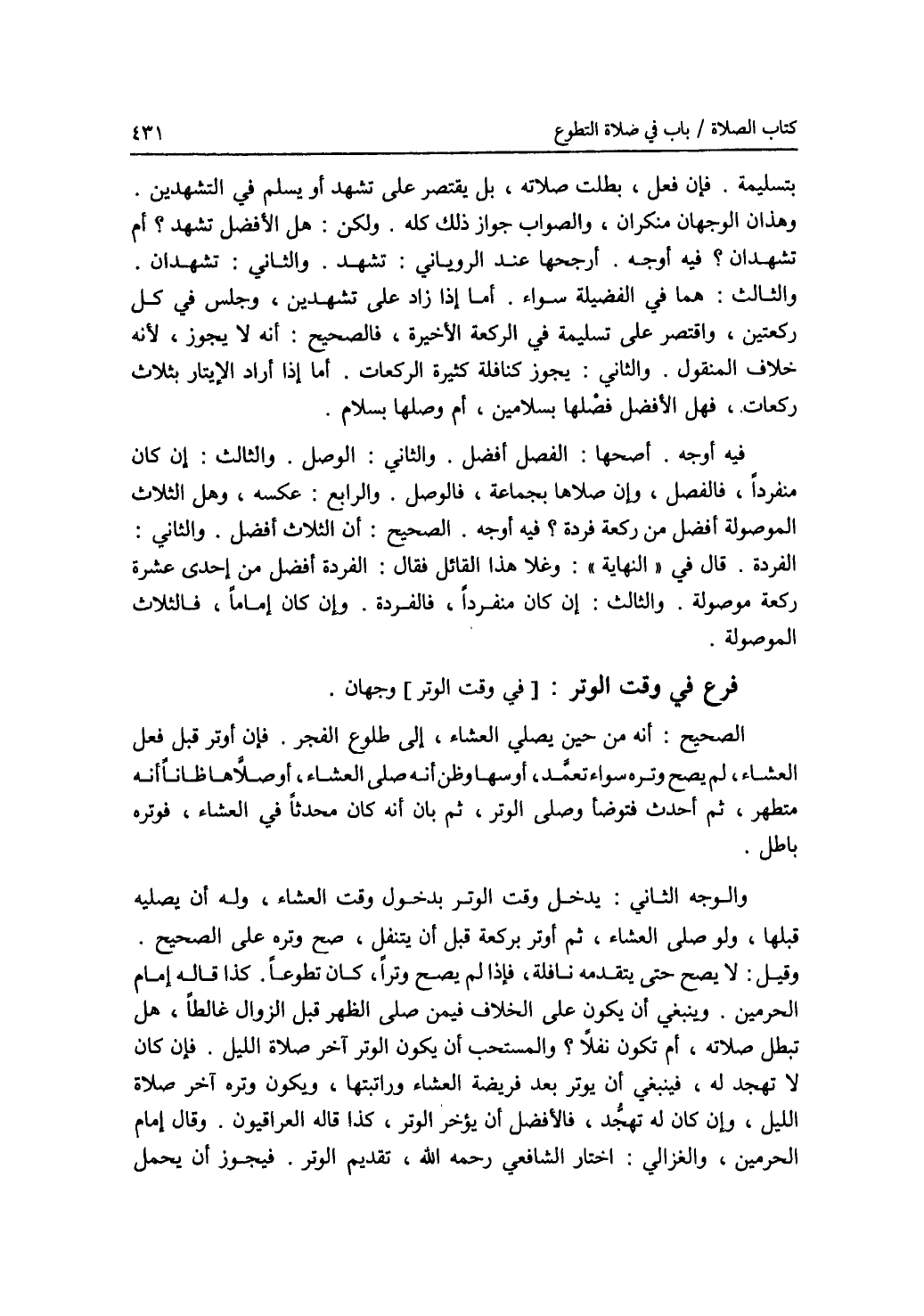 بتسليمة. فإن فعل، بطلت صلاته، بل يقتصر على تشهد أو يسلم في التشهدين. وهذان الوجهان منكران، والصواب جواز ذلك كله. ولكن: هل الافضل تشهد ؟ أم تشهدان ؟ فيه أوجه. أرجحها عند الروياني: تشهد. والثاني: تشهدان. والثالث: هما في الفضيلة سواء. أما إذا زاد على تشهدين، وجلس في كل ركعتين، واقتصر على تسليمة في الركعة الاخيرة، فالصحيح: أنه لا يجوز، لانه خلاف المنقول. والثاني: يجوز كنافلة كثيرة الركعات. أما إذا أراد الايتار بثلاث ركعات، فهل الافضل فصلها بسلامين، أم وصلها بسلام. فيه أوجه. أصحها: الفصل أفضل. والثاني: الوصل. والثالث: إن كان منفردا، فالفصل، وإن صلاها بجماعة، فالوصل. والرابع: عكسه. وهل الثلاث الموصولة أفضل من ركعة فردة ؟ فيه أوجه. الصحيح: أن الثلاث أفضل. والثاني: الفردة. قال في (النهاية): وغلا هذا القائل فقال: الفردة أفضل من إحدى عشرة ركعة موصولة. والثالث: إن كان منفردا، فالفردة. وإن كان إماما، فالثلاث الموصولة. فرع في وقت الوتر: (في وقت الوتر) وجهان. الصحيح: أنه من حين يصلي العشاء، إلى طلوع الفجر. فإن أوتر قبل فعل العشاء، لم يصح وتره، سواء تعمد، أو سها وظن أنه صلى العشاء، أو صلاها ظانا أنه متطهر، ثم أحدث فتوضأ وصلى الوتر، ثم بان أنه كان محدثا في العشاء، فوتره باطل. والوجه الثاني: يدخل وقت الوتر بدخول وقت العشاء، وله أن يصليه قبلها. ولو صلى العشاء، ثم أوتر بركعة قبل أن يتنفل، صح وتره على الصحيح. وقيل: لا يصح حتى يتقدمه نافلة، فإذا لم يصح وترا، كان تطوعا. كذا قاله إمام الحرمين. وينبغي أن يكون على الخلاف فيمن صلى الظهر قبل الزوال غالطا، هل تبطل صلاته، أم تكون نفلا ؟ والمستحب أن يكون الوتر آخر صلاة الليل. فإن كان لا تهجد له، فينبغي أن يوتر بعد فريضة العشاء وراتبتها، ويكون وتره آخر صلاة الليل، وإن كان له تهجد، فالافضل أن يؤخر الوتر، كذا قاله العراقيون. وقال إمام الحرمين، والغزالي: اختار الشافعي رحمه الله، تقديم الوتر. فيجوز أن يحمل