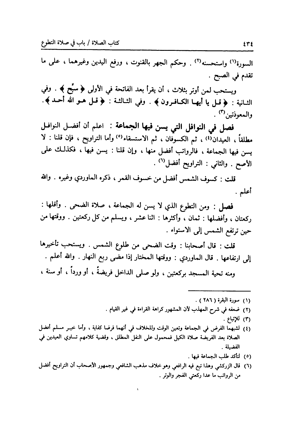 السورة (1) واستحسنه (2). وحكم الجهر بالقنوت، ورفع اليدين وغيرهما، على ما تقدم في الصبح. ويستحب لمن أوتر بثلاث، أن يقرأ بعد الفاتحة في الاولى: * (سبح) *. وفي الثانية: * (قل يا أيها الكافرون) *. وفي الثالثة: * (قل هو الله أحد) *. والمعوذتين (3). فصل في النوافل التي يسن فيها الجماعة: اعلم أن أفضل النوافل مطلقا، العيدان (4)، ثم الكسوفان، ثم الاستسقاء (5). وأما التراويح، فإن قلنا: لا يسن فيها الجماعة، فالرواتب أفضل منها، وإن قلنا: يسن فيها، فكذلك على الاصح. والثاني: التراويح أفضل (6). قلت: كسوف الشمس أفضل من خسوف القمر، ذكره الماوردي وغيره. والله أعلم. فصل: ومن التطوع الذي لا يسن له الجماعة، صلاة الضحى. وأقلها: ركعتان، وأفضلها: ثمان، وأكثرها: اثنا عشر، ويسلم من كل ركعتين. ووقتها من حين ترتفع الشمس إلى الاستواء. قلت: قال أصحابنا: وقت الضحى من طلوع الشمس. ويستحب تأخيرها إلى ارتفاعها. قال الماوردي: ووقتها المختار إذا مضى ربع النهار. والله أعلم. ومنه تحية المسجد بركعتين، ولو صلى الداخل فريضة، أو وردا، أو سنة،