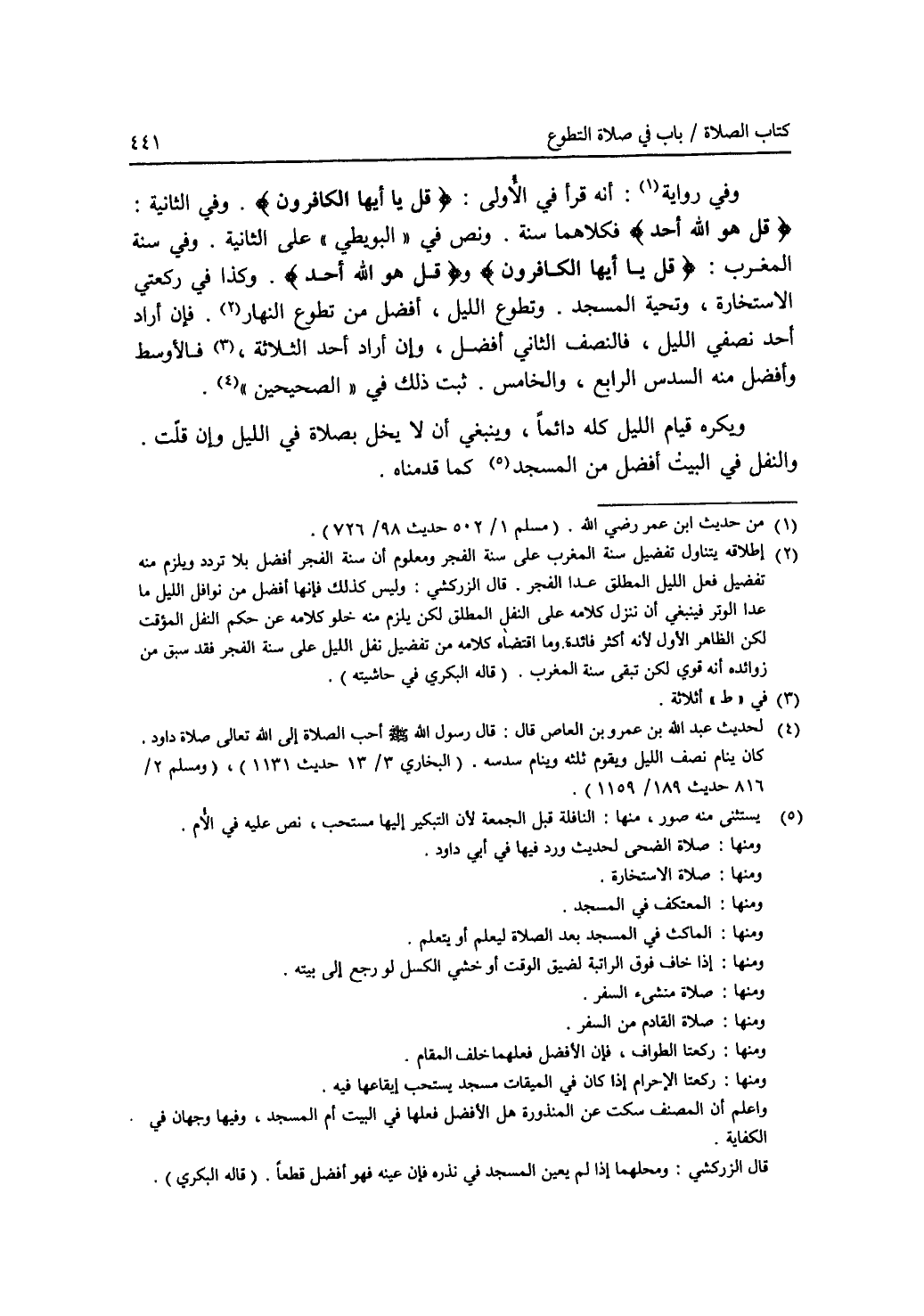 وفي رواية (1): أنه قرأ في الاولى: * (قل يا أيها الكافرون) *. وفي الثانية: * (قل هو الله أحد) * فكلاهما سنة. ونص في (البويطي) على الثانية. وفي سنة المغرب: * (قل يا أيها الكافرون) * و * (قل هو الله أحد) *. وكذا في ركعتي الاستخارة، وتحية المسجد. وتطوع الليل، أفضل من تطوع النهار (2). فإن أراد أحد نصفي الليل، فالنصف الثاني أفضل، وإن أراد أحد الثلاثه، (3) فالاوسط وأفضل منه السدس الرابع، والخامس. ثبت ذلك في (الصحيحين) (4). ويكره قيام الليل كله دائما، وينبغي أن لا يخل بصلاة في الليل وإن قلت. والنفل في البيت أفضل من المسجد (5)، كما قدمناه.