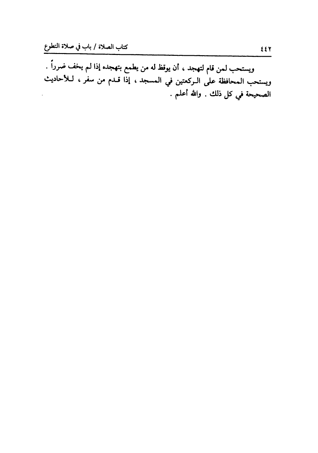 ويستحب لمن قام لتهجد، أن يوقظ له من يطمع بتهجده إذا لم يخف ضررا. ويستحب المحافظة على الركعتين في المسجد، إذا قدم من سفر، للاحاديث الصحيحة في كل ذلك. والله أعلم.