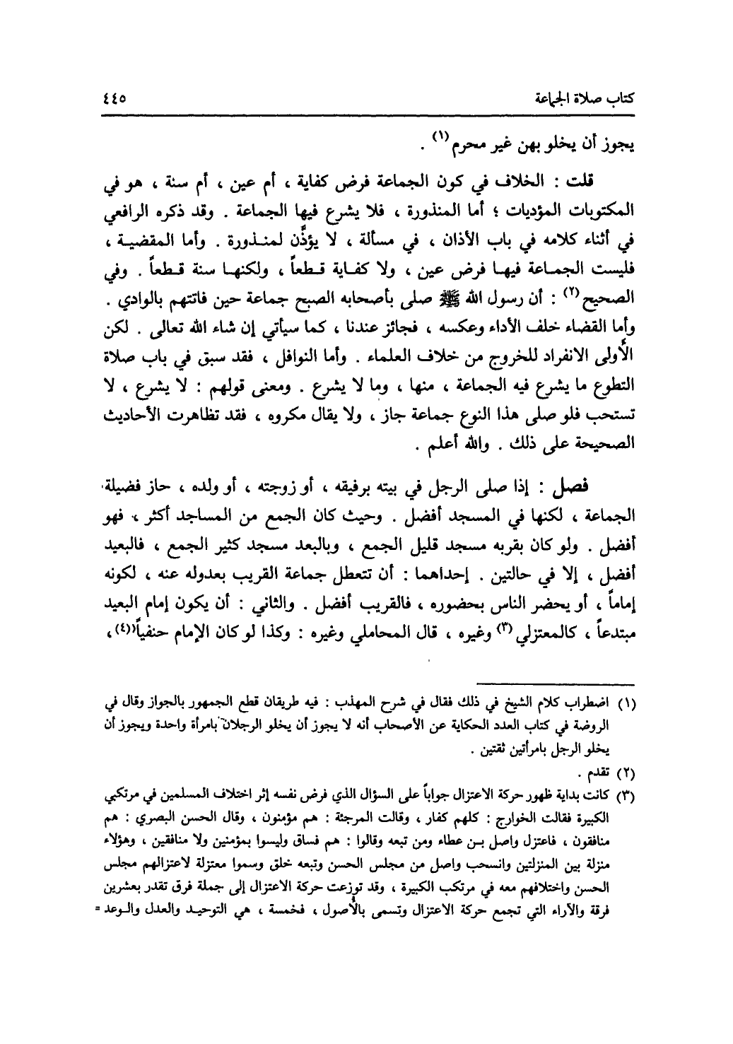 يجوز أن يخلو بهن غير محرم (1). قلت: الخلاف في كون الجماعة فرض كفاية، أم عين، أم سنة، هو في المكتوبات المؤديات، أما المنذورة، فلا يشرع فيها الجماعة. وقد ذكره الرافعي في أثناء كلامه في باب الاذان، في مسألة، لا يؤذن لمنذورة. وأما المقضية، فليست الجماعة فيها فرض عين، ولا كفاية قطعا، ولكنها سنة قطعا. وفي الصحيح (2): أن رسول الله - صلى الله عليه وسلم - صلى بأصحابه الصبح جماعة حين فاتتهم بالوادي. وأما القضاء خلف الاداء وعكسه، فجائز عندنا، كما سيأتي إن شاء الله تعالى. لكن الاولى الانفراد للخروج من خلاف العلماء. وأما النوافل، فقد سبق في باب صلاة التطوع ما يشرع فيه الجماعة، منها، وما لا يشرع. ومعنى قولهم: لا يشرع، لا تستحب فلو صلى هذا النوع جماعة جاز، ولا يقال مكروه، فقد تظاهرت الاحاديث الصحيحة على ذلك. والله أعلم. فصل: إذا صلى الرجل في بيته برفيقه، أو زوجته، أو ولده، حاز فضيلة الجماعة، لكنها في المسجد أفضل. وحيث كان الجمع من المساجد أكثر، فهو أفضل. ولو كان بقربه مسجد قليل الجمع، وبالبعد مسجد كثير الجمع، فالبعيد أفضل، إلا في حالتين. إحداهما: أن تتعطل جماعة القريب بعدوله عنه، لكونه إماما، أو يحضر الناس بحضوره، فالقريب أفضل. والثاني: أن يكون إمام البعيد مبتدعا، كالمعتزلي (3) وغيره، قال المحاملي وغيره: وكذا لو كان الامام حنفيا (4)،