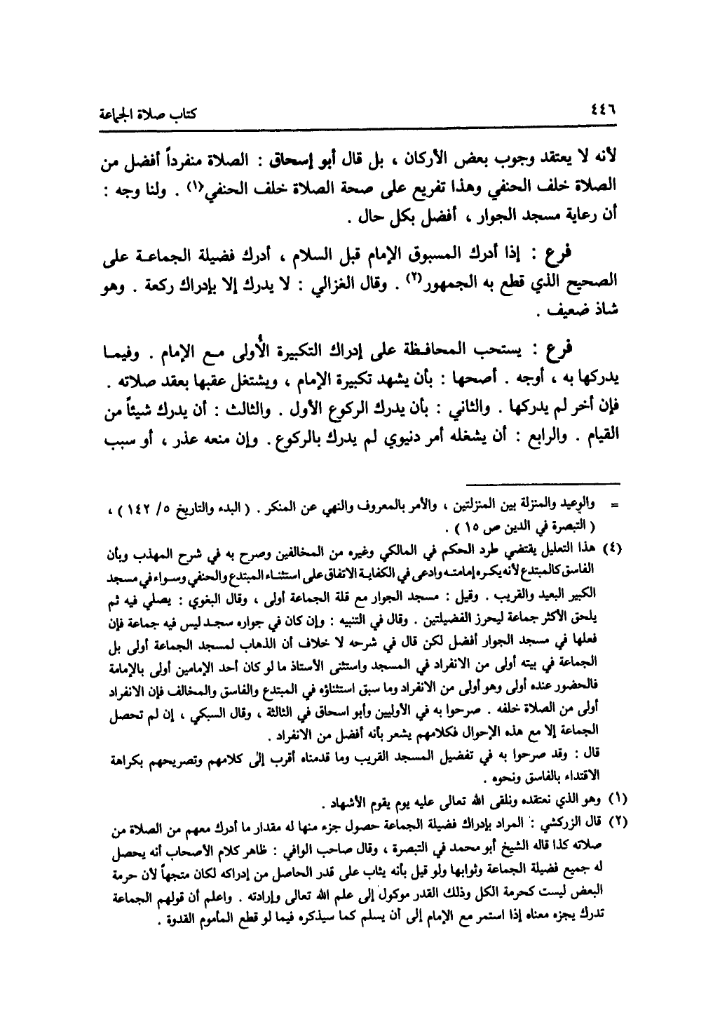 لانه لا يعتقد وجوب بعض الاركان، بل قال أبو إسحاق: الصلاة منفردا أفضل من الصلاة خلف الحنفي وهذا تفريع على صحة الصلاة خلف الحنفي (1). ولنا وجه: أن رعاية مسجد الجوار، أفضل بكل حال. فرع: إذا أدرك المسبوق الامام قبل السلام، أدرك فضيلة الجماعة على الصحيح الذي قطع به الجمهور (2). وقال الغزالي: لا يدرك إلا بإدراك ركعة. وهو شاذ ضعيف. فرع: يستحب المحافظة على إدراك التكبيرة الاولى مع الامام. وفيما يدركها به، أوجه. أصحها: بأن يشهد تكبيرة الامام، ويشتغل عقبها بعقد صلاته. فإن أخر لم يدركها. والثاني: بأن يدرك الركوع الاول. والثالث: أن يدرك شيئا من القيام. والرابع: أن يشغله أمر دنيوي لم يدرك بالركوع. وإن منعه عذر، أو سبب