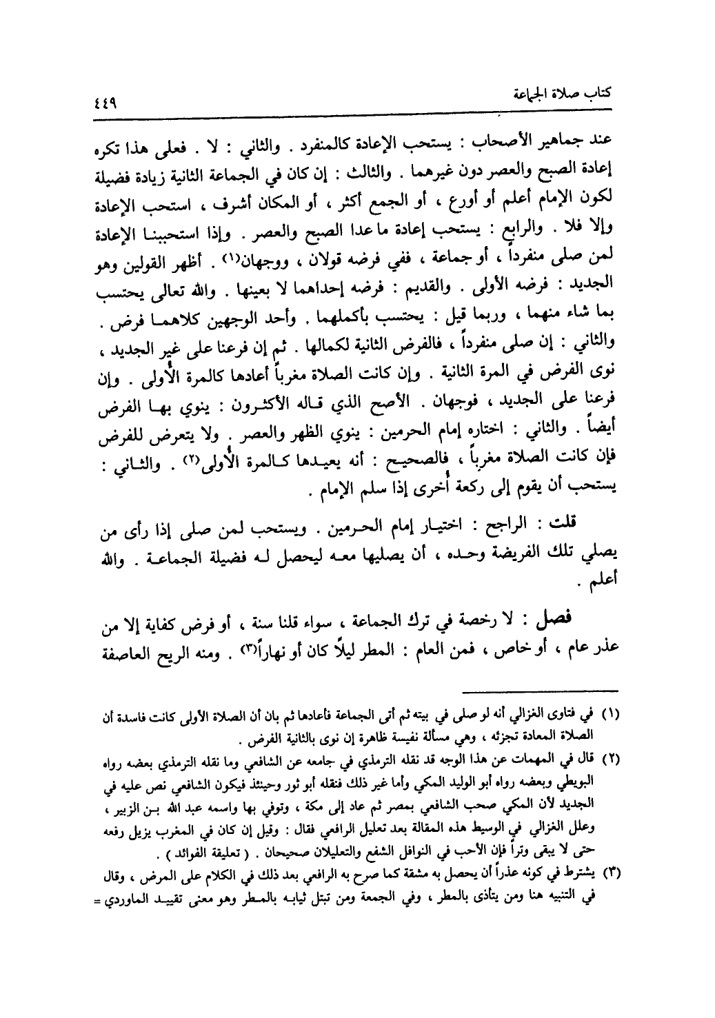 عند جماهير الاصحاب: يستحب الاعادة كالمنفرد. والثاني: لا. فعلى هذا تكره إعادة الصبح والعصر دون غيرهما. والثالث: إن كان في الجماعة الثانية زيادة فضيلة لكون الامام أعلم أو أورع، أو الجمع أكثر، أو المكان أشرف، استحب الاعادة وإلا فلا. والرابع: يستحب إعادة ما عدا الصبح والعصر. وإذا استحببنا الاعادة لمن صلى منفردا، أو جماعة، ففي فرضه قولان، ووجهان (1). أظهر القولين وهو الجديد: فرضه الاولى. والقديم: فرضه إحداهما لا بعينها. والله تعالى يحتسب بما شاء منهما، وربما قيل: يحتسب بأكملهما. وأحد الوجهين كلاهما فرض. والثاني: إن صلى منفردا، فالفرض الثانية لكمالها. ثم إن فرعنا على غير الجديد، نوى الفرض في المرة الثانية. وإن كانت الصلاة مغربا أعادها كالمرة الاولى. وإن فرعنا على الجديد، فوجهان. الاصح الذي قاله الاكثرون: ينوي بها الفرض أيضا. والثاني: اختاره إمام الحرمين: ينوي الظهر والعصر. ولا يتعرض للفرض فإن كانت الصلاة مغربا. فالصحيح: أنه يعيدها كالمرة الاولى (2). والثاني: يستحب أن يقوم إلى ركعة أخرى إذا سلم الامام. قلت: الراجح: اختيار إمام الحرمين. ويستحب لمن صلى إذا رأى من يصلي تلك الفريضة وحده، أن يصليها معه ليحصل له فضيلة الجماعة. والله أعلم.