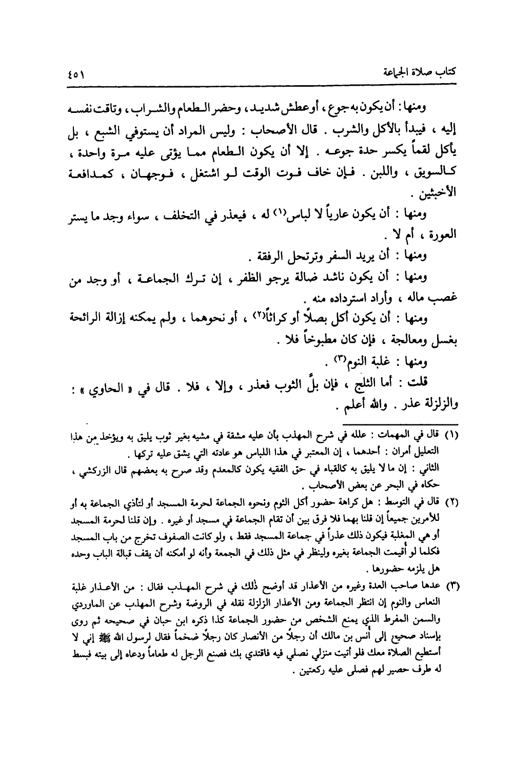 ومنها: أن يكون به جوع، أو عطش شديد، وحضر الطعام والشراب، وتاقت نفسه إليه، فيبدأ بالاكل والشرب. قال الاصحاب: وليس المراد أن يستوفي الشبع، بل يأكل لقما يكسر حدة جوعه. إلا أن يكون الطعام مما يؤتى عليه مرة واحدة، كالسويق، واللبن. فإن خاف فوت الوقت لو اشتغل، فوجهان، كمدافعة الاخبثين. ومنها: أن يكون عاريا لا لباس (1) له، فيعذر في التخلف، سواء وجد ما يستر العورة، أم لا. ومنها: أن يريد السفر وترتحل الرفقة. ومنها: أن يكون ناشد ضالة يرجو الظفر، إن ترك الجماعة، أو وجد من غصب ماله، وأراد استرداده منه. ومنها: أن يكون أكل بصلا، أو كراثا (2)، أو نحوهما، ولم يمكنه إزالة الرائحة بغسل ومعالجة، فإن كان مطبوخا فلا. ومنها: غلبة النوم (3). قلت: أما الثلج، فإن بل الثوب فعذر، وإلا، فلا. قال في (الحاوي): والزلزلة عذر. والله أعلم.