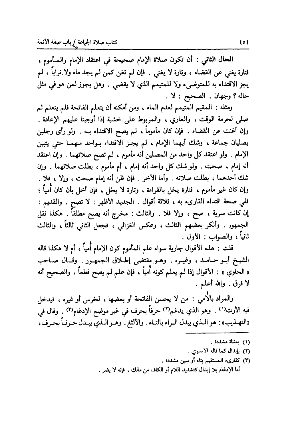 الحال الثاني: أن تكون صلاة الامام صحيحة في اعتقاد الامام والمأموم، فتارة يغني عن القضاء، وتارة لا يغني. فإن لم تغن كمن لم يجد ماء ولا ترابا، لم يجز الاقتداء به للمتوضئ ولا للمتيمم الذي لا يقضي. وهل يجوز لمن هو في مثل حاله ؟ وجهان. الصحيح: لا. ومثله: المقيم المتيمم لعدم الماء، ومن أمكنه أن يتعلم الفاتحة فلم يتعلم ثم صلى لحرمة الوقت، والعاري، والمربوط على خشبة إذا أوجبنا عليهم الاعادة. وإن أغنت عن القضاء. فإن كان مأموما، لم يصح الاقتداء به. ولو رأى رجلين يصليان جماعة، وشك أيهما الامام، لم يجز الاقتداء بواحد منهما حتى يتبين الامام. ولو اعتقد كل واحد من المصلين أنه مأموم، لم تصح صلاتهما. وإن اعتقد أنه إمام، صحت. ولو شك كل واحد أنه إمام، أم مأموم، بطلت صلاتهما. وإن شك أحدهما، بطلت صلاته. وأما الآخر، فإن ظن أنه إمام صحت، وإلا، فلا. وإن كان غير مأموم، فتارة يخل بالقراءة، وتارة لا يخل، فإن أخل بأن كان أميا، ففي صحة اقتداء القارئ به، ثلاثة أقوال. الجديد الاظهر: لا تصح. والقديم: إن كانت سرية، صح، وإلا فلا. والثالث: مخرج أنه يصح مطلقا. هكذا نقل الجمهور. وأنكر بعضهم الثالث، وعكس الغزالي، فجعل الثاني ثالثا، والثالث ثانيا، والصواب: الاول. قلت: هذه الاقوال جارية سواء علم المأموم كون الامام أميا، أم لا هكذا قاله الشيخ أبو حامد، وغيره. وهو مقتضى اطلاق الجمهور. وقال صاحب (الحاوي): الاقوال إذا لم يعلم كونه أميا، فإن علم لم يصقطعا، والصحيح أنه لا فرق. والله أعلم. والمراد بالامي: من لا يحسن الفاتحة أو بعضها، لخرس أو غيره، فيدخل فيه الارت (1). وهو الذي يدغم (2) حرفا بحرف في غير موضع الادغام (3). وقال في (التهذيب): هو الذي يبدل الراء بالتاء. والالثغ: وهو الذي يبدل حرفا بحرف،