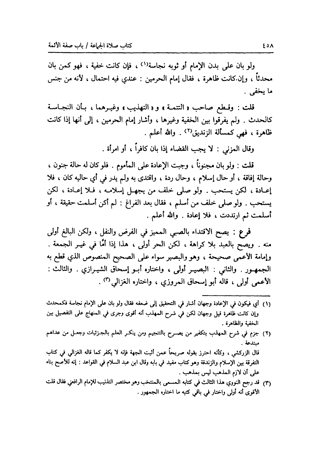 ولو بان على بدن الامام أو ثوبه نجاسة (1)، فإن كانت خفية، فهو كمن بان محدثا، وإن كانت ظاهرة، فقال إمام الحرمين: عندي فيه احتمال، لانه من جنس ما يخفى. قلت: وقطع صاحب (التتمة) و (التهذيب) وغيرهما، بأن النجاسة كالحدث. ولم يفرقوا بين الخفية وغيرها، وأشار إمام الحرمين، إلى أنها إذا كانت ظاهرة، فهي كمسألة الزنديق (2). والله أعلم. وقال المزني: لا يجب القضاء إذا بان كافرا، أو امرأة. قلت: ولو بان مجنونا، وجبت الاعادة على المأموم. فلو كان له حالة جنون، وحالة إفاقة، أو حال إسلام، وحال ردة، واقتدى به ولم يدر في أي حاليه كان، فلا إعادة، لكن يستحب. ولو صلى خلف من يجهل إسلامه، فلا إعادة، لكن يستحب. ولو صلى خلف من أسلم، فقال بعد الفراغ: لم أكن أسلمت حقيقة، أو أسلمت ثم ارتددت، فلا إعادة. والله أعلم. فرع: يصح الاقتداء بالصبي المميز في الفرض والنفل، ولكن البالغ أولى منه. ويصح بالعبد بلا كراهة، لكن الحر أولى، هذا إذا أما في غير الجمعة. وإمامة الاعمى صحيحة، وهو والبصير سواء على الصحيح المنصوص الذي قطع به الجمهور. والثاني: البصير أولى، واختاره أبو إسحاق الشيرازي. والثالث: الاعمى أولى، قاله أبو إسحاق المروزي، واختاره الغزالي (3).