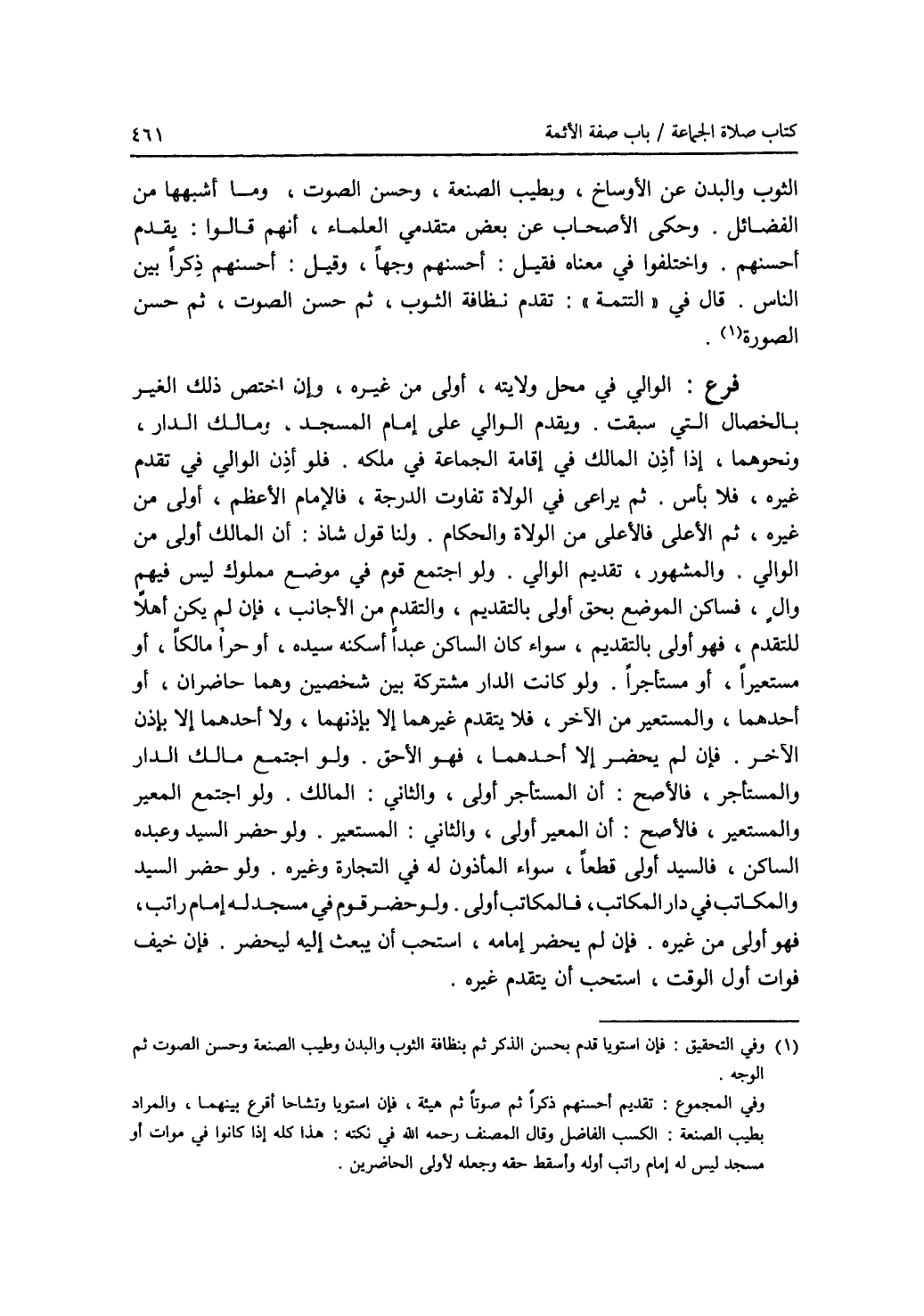 الثوب والبدن عن الاوساخ، وبطيب الصنعة، وحسن الصوت، وما أشبهها من الفضائل. وحكى الاصحاب عن بعض متقدمي العلماء، أنهم قالوا: يقدم أحسنهم. واختلفوا في معناه. فقيل: أحسنهم وجها، وقيل: أحسنهم ذكرا بين الناس. قال في (التتمة): تقدم نظافة الثوب، ثم حسن الصوت، ثم حسن الصورة (1). فرع: الوالي في محل ولايته، أولى من غيره، وإن اختص ذلك الغير بالخصال الذي سبقت. ويقدم الوالي على إمام المسجد، ومالك الدار، ونحوهما، إذا أذن المالك في إقامة الجماعة في ملكه. فلو أذن الوالي في تقدم غيره، فلا بأس. ثم يراعى في الولاة تفاوت الدرجة، فالامام الاعظم، أولى من غيره، ثم الاعلى فالاعلى من الولاة والحكام. ولنا قول شاذ: أن المالك أولى من الوالي. والمشهور، تقديم الوالي. ولو اجتمع قوم في موضع مملوك ليس فيهم وال، فساكن الموضع بحق أولى بالتقديم، والتقدم من الاجانب، فإن لم يكن أهلا للتقدم، فهو أولى بالتقديم، سواء كان الساكن عبدا أسكنه سيده، أو حرا مالكا، أو مستعيرا، أو مستأجرا. ولو كانت الدار مشتركة بين شخصين وهما حاضران، أو أحدهما، والمستعير من الآخر، فلا يتقدم غيرهما إلا بإذنهما، ولا أحدهما إلا بإذن الآخر. فإن لم يحضر إلا أحدهما، فهو الاحق. ولو اجتمع مالك الدار والمستأجر، فالاصح: أن المستأجر أولى، والثاني: المالك. ولو اجتمع المعير والمستعير، فالاصح: أن المعير أولى، والثاني: المستعير. ولو حضر السيد وعبده الساكن، فالسيد أولى قطعا، سواء المأذون له في التجارة وغيره. ولو حضر السيد والمكاتب في دار المكاتب، فالمكاتب أولى. ولو حضر قوم في مسجد له إمام راتب، فهو أولى من غيره. فإن لم يحضر إمامه، استحب أن يبعث إليه ليحضر. فإن خيف فوات أول الوقت، استحب أن يتقدم غيره.