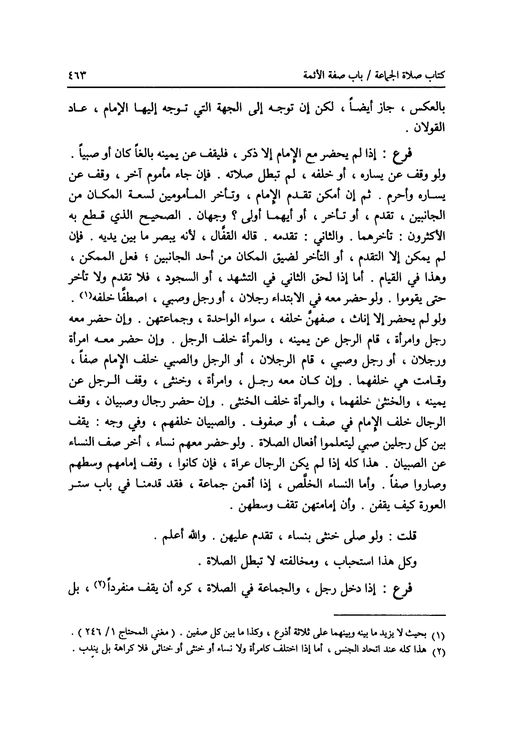 بالعكس، جاز أيضا، لكن إن توجه إلى الجهة التي توجه إليها الامام، عاد القولان. فرع: إذا لم يحضر مع الامام إلا ذكر، فليقف عن يمينه بالغا كان أو صبيا، ولو وقف عن يساره، أو خلفه، لم تبطل صلاته. فإن جاء مأموم آخر، وقف عن يساره وأحرم. ثم إن أمكن تقدم الامام، وتأخر المأمومين لسعة المكان من الجانبين، تقدم، أو تأخر، أو أيهما أولى ؟ وجهان. الصحيح الذي قطع به الاكثرون: تأخرهما. والثاني: تقدمه. قاله القفال، لانه يبصر ما بين يديه. فإن لم يمكن إلا التقدم، أو التأخر لضيق المكان من أحد الجانبين، فعل الممكن، وهذا في القيام. أما إذا لحق الثاني في التشهد، أو السجود، فلا تقدم ولا تأخر حتى يقوموا. ولو حضر معه في الابتداء رجلان، أو رجل وصبي، اصطفا خلفه (1). ولو لم يحضر معه إلا إناث، صفهن خلفه، سواء الواحدة، وجماعتهن. وإن حضر معه رجل وامرأة، قام الرجل عن يمينه، والمرأة خلف الرجل. وإن حضر معه امرأة ورجلان، أو رجل وصبي، قام الرجلان، أو الرجل والصبي خلف الامام صفا، وقامت هي خلفهما. وإن كان معه رجل، وامرأة، وخنثى، وقف الرجل عن يمينه، والخنثى خلفهما، والمرأة خلف الخنثى. وإن حضر رجال وصبيان، وقف الرجال خلف الامام في صف، أو صفوف. والصبيان خلفهم، وفي وجه: يقف بين كل رجلين صبي ليتعلموا أفعال الصلاة. ولو حضر معهم نساء، أخر صف النساء عن الصبيان. هذا كله إذا لم يكن الرجال عراة، فإن كانوا، وقف إمامهم وسطهم وصاروا صفا. وأما النساء الخلص، إذا أقمن جماعة، فقد قدمنا في باب ستر العورة كيف يقفن. وأن إمامتهن تقف وسطهن. قلت: ولو صلى خنثى بنساء، تقدم عليهن. والله أعلم. وكل هذا استحباب، ومخالفته لا تبطل الصلاة. فرع: إذا دخل رجل، والجماعة في الصلاة، كره أن يقف منفردا (2)، بل