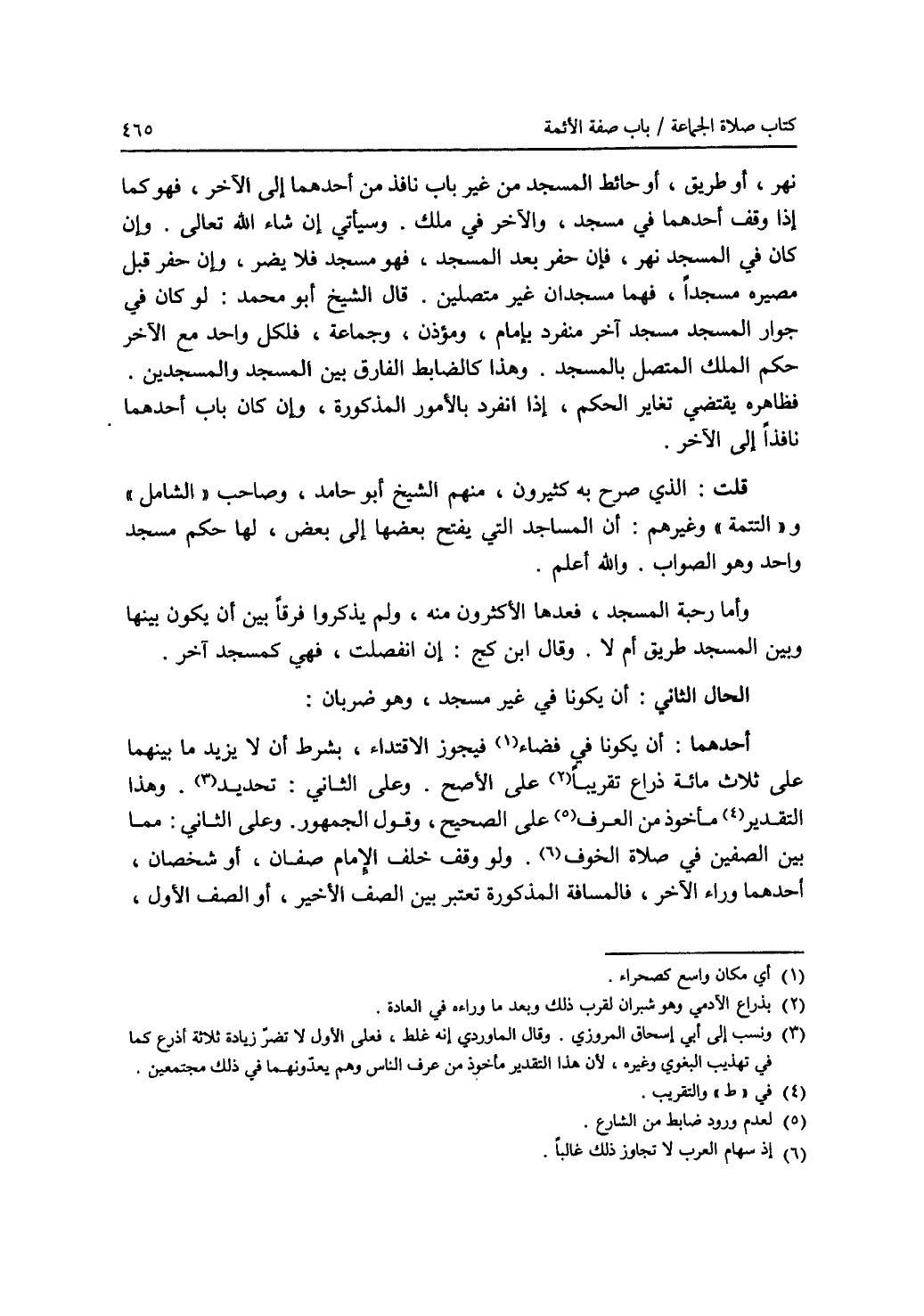 نهر، أو طريق، أو حائط المسجد من غير باب نافذ من أحدهما إلى الآخر، فهو كما إذا وقف أحدهما في مسجد، والآخر في ملك. وسيأتي إن شاء الله تعالى. وإن كان في المسجد نهر، فإن حفر النهر بعد المسجد، فهو مسجد فلا يضر، وإن حفر قبل مصيره مسجدا، فهما مسجدان غير متصلين. قال الشيخ أبو محمد: لو كان في جوار المسجد مسجد آخر منفرد بإمام، ومؤذن، وجماعة، فلكل واحد مع الآخر حكم الملك المتصل بالمسجد. وهذا كالضابط الفارق بين المسجد والمسجدين. فظاهره يقتضي تغاير الحكم، إذا انفرد بالامور المذكورة، وإن كان باب أحدهما نافذا إلى الآخر. قلت: الذي صرح به كثيرون، منهم الشيخ أبو حامد، وصاحب (الشامل) و (التتمة)، وغيرهم: أن المساجد التي يفتح بعضها إلى بعض، لها حكم مسجد واحد وهو الصواب. والله أعلم. وأما رحبة المسجد، فعدها الاكثرون منه، ولم يذكروا فرقا بين أن يكون بينها وبين المسجد طريق أم لا. وقال ابن كج: إن انفصلت، فهي كمسجد آخر. الحال الثاني: أن يكون في غير مسجد، وهو ضربان: أحدهما: أن يكون في فضاء (1) فيجوز الاقتداء، بشرط أن لا يزيد ما بينهما على ثلاث مائة ذراع تقريبا (2) على الاصح. وعلى الثاني: تحديد (3). وهذا التقدير (4) مأخوذ من العرف (5) على الصحيح، وقول الجمهور. وعلى الثاني: مما بين الصفين في صلاة الخوف (6). ولو وقف خلف الامام صفان، أو شخصان، أحدهما وراء الآخر، فالمسافة المذكورة تعتبر بين الصف الاخير، أو الصف الاول،