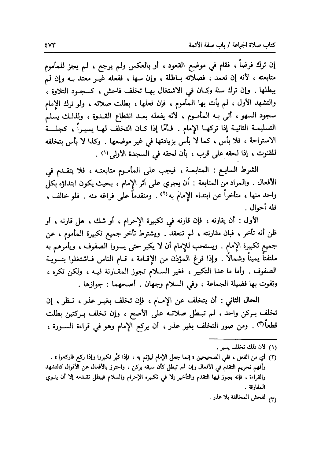 إن ترك فرضا، فقام في موضع القعود، أو بالعكس ولم يرجع، لم يجز للمأموم متابعته، لانه إن تعمد، فصلاته باطلة، وإن سها، ففعله غير معتد به وإن لم يبطلها. ولو ترك سنة وكان في الاشتغال بها تخلف فاحش، كسجود التلاوة، والتشهد الاول، لم يأت بها المأموم، فإن فعلها، بطلت صلاته، ولو ترك الامام سجود السهو، أتى به المأموم، لانه يفعله بعد انقطاع القدوة، ولذلك يسلم التسليمة الثانية إذا تركها الامام. فأما إذا كان التخلف لها يسيرا، كجلسة الاستراحة، فلا بأس، كما لا بأس بزيادتها في غير موضعها. وكذا لا بأس بتخلفه للقنوت، إذا لحقه على قرب، بأن لحقه في السجدة الاولى (1). الشرط السابع: المتابعة، فيجب على المأموم متابعته، فلا يتقدم في الافعال. والمراد من المتابعة: أن يجري على أثر الامام، بحيث يكون بتداؤه بكل واحد منها، متأخرا عن ابتداء الامام به (2)، ومتقدما على فراغه منه. فلو خالف، فله أحوال. الاول: أن يقارنه، فإن قارنه في تكبيرة الاحرام، أو شك، هل قارنه، أو ظن أنه تأخر، فبان مقارنته، لم تنعقد. ويشترط تأخر جميع تكبيرة المأموم، عن جميع تكبيرة الامام. ويستحب للامام أن لا يكبر حتى يسووا الصفوف، ويأمرهم به ملتفتا يمينا وشمالا. وإذا فرغ المؤذن من الاقامة، قام الناس فاشتغلوا بتسوية الصفوف. وأما ما عدا التكبير، فغير السلام تجوز المقارنة فيه، ولكن تكره، وتفوت بها فضيلة الجماعة، وفي السلام وجهان. أصحهما: جوازها. الحال الثاني: أن يتخلف عن الامام، فإن تخلف بغير عذر، نظر، إن تخلف بركن واحد، لم تبطل صلاته على الاصح، وإن تخلف بركنين بطلت قطعا (3). ومن صور التخلف بغير عذر، أن يركع الامام وهو في قراءة السورة،