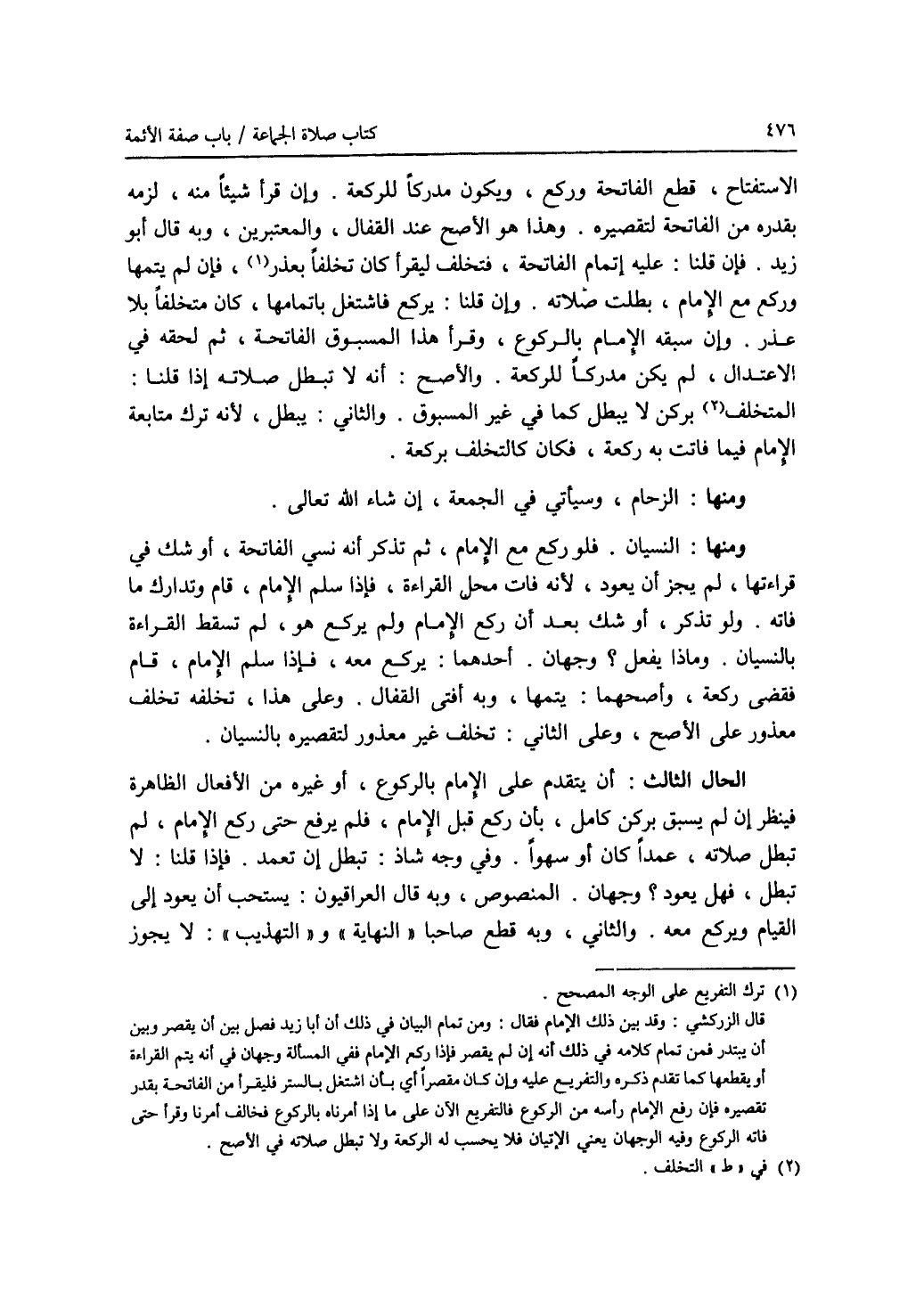 الاستفتاح، قطع الفاتحة وركع، ويكون مدركا للركعة. وإن قرأ شيئا منه، لزمه بقدره من الفاتحة لتقصيره. وهذا هو الاصح عند القفال، والمعتبرين، وبه قال أبو زيد. فإن قلنا: عليه إتمام الفاتحة، فتخلف ليقرأ كان تخلفا بعذر (1)، فإن لم يتمها وركع مع الامام، بطلت صلاته. وإن قلنا: يركع فاشتغل بإتمامها، كان متخلفا بلا عذر. وإن سبقه الامام بالركوع، وقرأ هذا المسبوق الفاتحة، ثم لحقه في الاعتدال، لم يكن مدركا للركعة. والاصح: أنه لا تبطل صلاته إذا قلنا: المتخلف (2) بركن لا يبطل كما في غير المسبوق. والثاني: يبطل، لانه ترك متابعة الامام فيما فاتت به ركعة، فكان كالتخلف بركعة. ومنها: الزحام، وسيأتي في الجمعة، إن شاء الله تعالى. ومنها: النسيان. فلو ركع مع الامام، ثم تذكر أنه نسي الفاتحة، أو شك في قراءتها، لم يجز أن يعود، لانه فات محل القراءة، فإذا سلم الامام، قام وتدارك ما فاته. ولو تذكر، أو شك بعد أن ركع الامام ولم يركع هو، لم تسقط القراءة بالنسيان. وماذا يفعل ؟ وجهان. أحدهما: يركع معه، فإذا سلم الامام، قام فقضى ركعة، وأصحهما: يتمها، وبه أفتى القفال. وعلى هذا، تخلفه تخلف معذور على الاصح، وعلى الثاني: تخلف غير معذور لتقصيره بالنسيان. الحال الثالث: أن يتقدم على الامام بالركوع، أو غيره من الافعال الظاهرة فينظر إن لم يسبق بركن كامل، بأن ركع قبل الامام، فلم يرفع حتى ركع الامام، لم تبطل صلاته، عمدا كان أو سهوا. وفي وجه شاذ: تبطل إن تعمد. فإذا قلنا: لا تبطل، فهل يعود ؟ وجهان. المنصوص، وبه قال العراقيون: يستحب أن يعود إلى القيام ويركع معه. والثاني: وبه قطع صاحبا (النهاية) و (التهذيب): لا يجوز