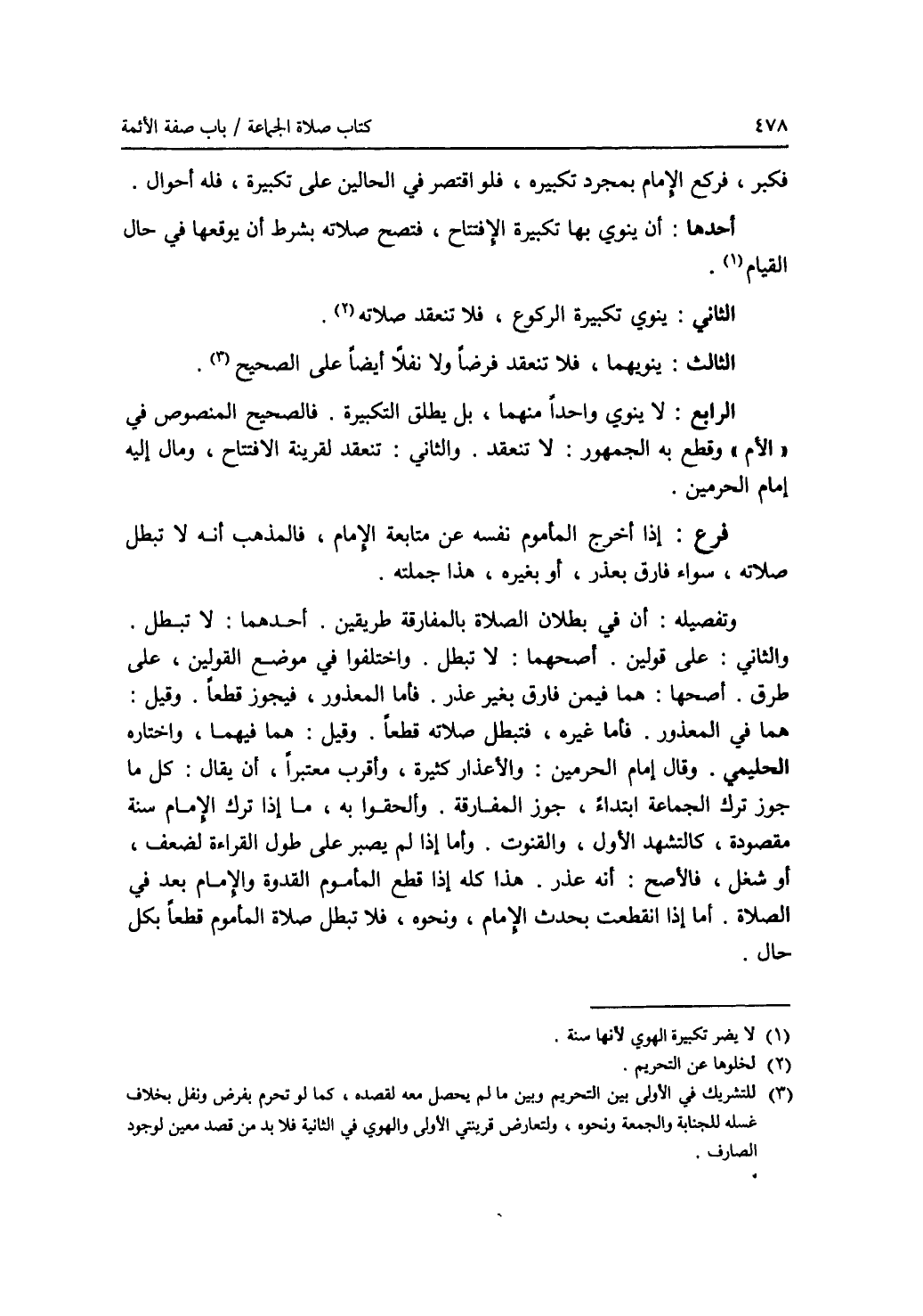 فكبر، فركع الامام بمجرد تكبيره، فلو اقتصر في الحالين على تكبيرة، فله أحوال. أحدها: أن ينوي بها تكبيرة الافتتاح، فتصح صلاته بشرط أن يوقعها في حال القيام (1). الثاني: ينوي تكبيرة الركوع فلا تنعقد صلاته (2). الثالث: ينويهما، فلا تنعقد فرضا ولا نفلا أيضا على الصحيح (3). الرابع: لا ينوي واحدا منهما، بل يطلق التكبيرة. فالصحيح المنصوص في (الام) وقطع به الجمهور: لا تنعقد. والثاني: تنعقد لقرينة الافتتاح، ومال إليه إمام الحرمين. فرع: إذا أخرج المأموم نفسه عن متابعة الامام، فالمذهب أنه لا تبطل صلاته، سواء فارق بعذر، أو بغيره، هذا جملته. وتفصيله: أن في بطلان الصلاة بالمفارقة طريقين. أحدهما: لا تبطل. والثاني: على قولين. أصحهما: لا تبطل. واختلفوا في موضع القولين، على طرق. أصحها: هما فيمن فارق بغير عذر. فأما المعذور، فيجوز قطعا. وقيل: هما في المعذور. فأما غيره، فتبطل صلاته قطعا. وقيل: هما فيهما، واختاره الحليمي. وقال إمام الحرمين: والاعذار كثيرة، وأقرب معتبرا، أن يقال: كل ما جوز ترك الجماعة ابتداء، جوز المفارقة. وألحقوا به، ما إذا ترك الامام سنة مقصودة، كالتشهد الاول، والقنوت. وأما إذا لم يصبر على طول القراءة لضعف، أو شغل، فالاصح: أنه عذر. هذا كله إذا قطع المأموم القدوة والامام بعد في الصلاة. أما إذا انقطعت بحدث الامام، ونحوه، فلا تبطل صلاة المأموم قطعا بكل حال.