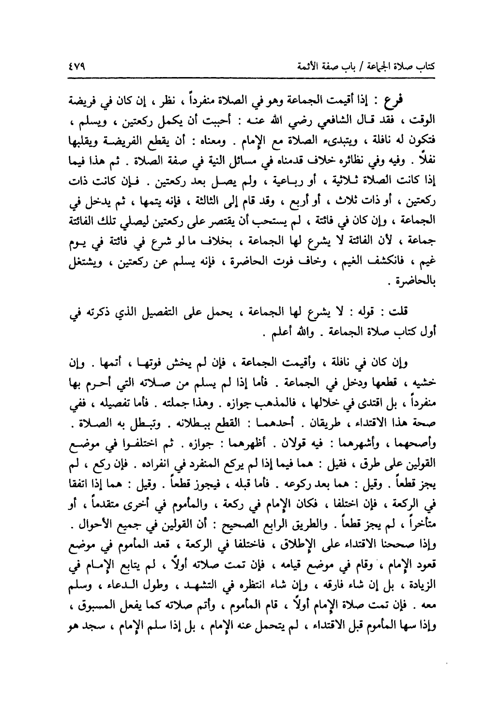فرع: إذا أقيمت الجماعة وهو في الصلاة منفردا، نظر، إن كان في فريضة الوقت، فقد قال الشافعي رضي الله عنه: أحببت أن يكمل ركعتين، ويسلم، فتكون له نافلة، ويبتدئ الصلاة مع الامام. ومعناه: أن يقطع الفريضة ويقلبها نفلا. وفيه وفي نظائره خلاف قدمناه في مسائل النية في صفة الصلاة. ثم هذا فيما إذا كانت الصلاة ثلاثية، أو رباعية، ولم يصل بعد ركعتين. فإن كانت ذات ركعتين، أو ذات ثلاث، أو أربع، وقد قام إلى الثالثة، فإنه يتمها، ثم يدخل في الجماعة، وإن كان في فائتة، لم يستحب أن يقتصر على ركعتين ليصلي تلك الفائتة جماعة، لان الفائتة لا يشرع لها الجماعة، بخلاف ما لو شرع في فائتة في يوم غيم، فانكشف الغيم، وخاف فوت الحاضرة، فإنه يسلم عن ركعتين، ويشتغل بالحاضرة. قلت: قوله: لا يشرع لها الجماعة، يحمل على التفصيل الذي ذكرته في أول كتاب صلاة الجماعة. والله أعلم. وإن كان في نافلة، وأقيمت الجماعة، فإن لم يخش فوتها، أتمها. وإن خشيه، قطعها ودخل في الجماعة. فأما إذا لم يسلم من صلاته التي أحرم بها منفردا، بل اقتدى في خلالها، فالمذهب جوازه. وهذا جملته. فأما تفصيله، ففي صحة هذا الاقتداء، طريقان. أحدهما: القطع ببطلانه. وتبطل به الصلاة. وأصحهما، وأشهرهما: فيه قولان. أظهرهما: جوازه. ثم اختلفوا في موضع القولين على طرق، فقيل: هما فيما إذا لم يركع المنفرد في انفراده. فإن ركع، لم يجز قطعا. وقيل: هما بعد ركوعه. فأما قبله، فيجوز قطعا. وقيل: هما إذا اتفقا في الركعة، فإن اختلفا، فكان الامام في ركعة، والمأموم في أخرى متقدما، أو متأخرا، لم يجز قطعا. والطريق الرابع الصحيح: أن القولين في جميع الاحوال. وإذا صححنا الاقتداء على الاطلاق، فاختلفا في الركعة، قعد المأموم في موضع قعود الامام، وقام في موضع قيامه، فإن تمت صلاته أولا، لم يتابع الامام في الزيادة، بل إن شاء فارقه، وإن شاء انتظره في التشهد، وطول الدعاء، وسلم معه. فإن تمت صلاة الامام أولا، قام المأموم، وأتم صلاته كما يفعل المسبوق، وإذا سها المأموم قبل الاقتداء، لم يتحمل عنه الامام، بل إذا سلم الامام، سجد هو
