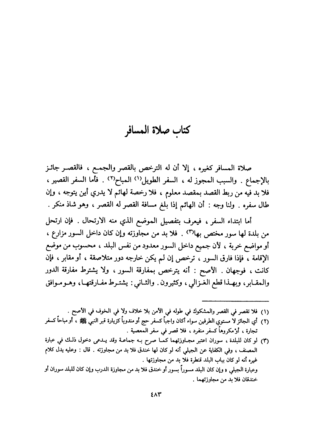 صلاة المسافر كغيره، إلا أن له الترخص بالقصر والجمع، فالقصر جائز بالاجماع. والسبب المجوز له، السفر الطويل (1) المباح (2). فأما السفر القصير، فلا بد فيه من ربط القصد بمقصد معلوم، فلا رخصة لهائم لا يدري أين يتوجه، وإن طال سفره. ولنا وجه: أن الهائم إذا بلغ مسافة القصر له القصر، وهو شاذ منكر. أما ابتداء السفر، فيعرف بتفصيل الموضع الذي منه الارتحال. فإن ارتحل من بلدة لها سور مختص بها (3)، فلا بد من مجاوزته وإن كان داخل السور مزارع، أو مواضع خربة، لان جميع داخل السور معدود من نفس البلد، محسوب من موضع الاقامة، فإذا فارق السور، ترخص إن لم يكن خارجه دور متلاصقة، أو مقابر، فإن كانت، فوجهان. الاصح: أنه يترخص بمفارقة السور، ولا يشترط مفارقة الدور والمقابر، وبهذا قطع الغزالي، وكثيرون. والثاني: يشترط مفارقتها، وهو موافق
