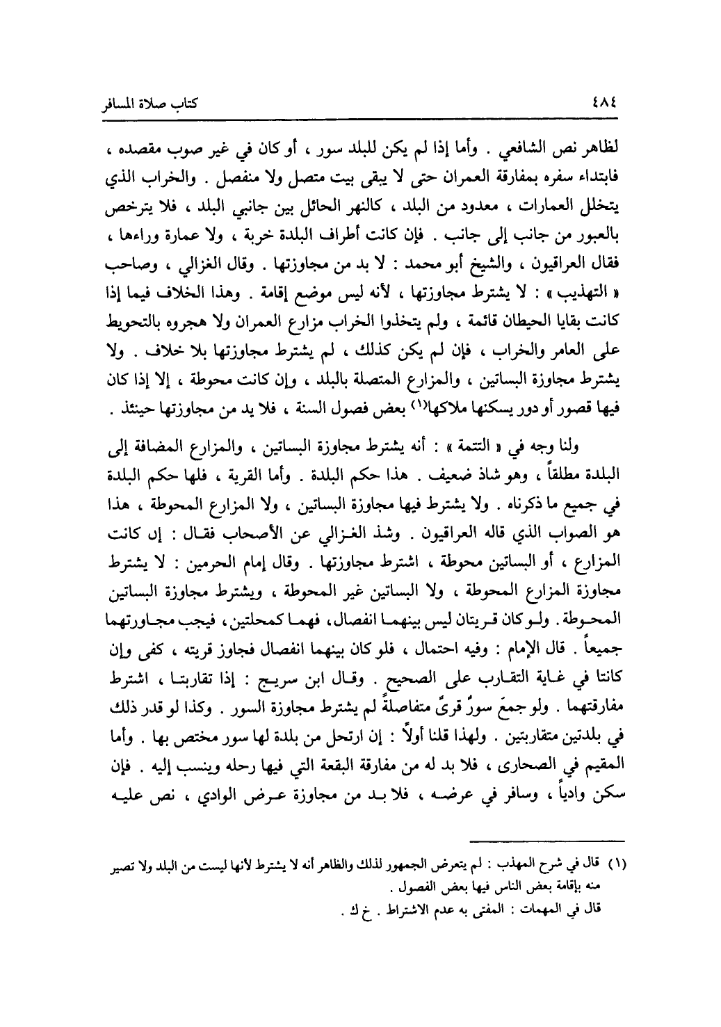 لظاهر نص الشافعي. وأما إذا لم يكن للبلد سور، أو كان في غير صوب مقصده، فابتداء سفره بمفارقة العمران حتى لا يبقى بيت متصل ولا منفصل. والخراب الذي يتخلل العمارات، معدود من البلد، كالنهر الحائل بين جانبي البلد، فلا يترخص بالعبور من جانب إلى جانب. فإن كانت أطراف البلدة خربة، ولا عمارة وراءها، فقال العراقيون، والشيخ أبو محمد: لا بد من مجاوزتها. وقال الغزالي، وصاحب (التهذيب): لا يشترط مجاوزتها، لانه ليس موضع إقامة. وهذا الخلاف فيما إذا كانت بقايا الحيطان قائمة، ولم يتخذوا الخراب مزارع العمران، ولا هجروه بالتحويط على العامر والخراب، فإن لم يكن كذلك، لم يشترط مجاوزتها بلا خلاف. ولا يشترط مجاوزة البساتين، والمزارع المتصلة بالبلد، وإن كانت محوطة، إلا إذا كان فيها قصور أو دور يسكنها ملاكها (1) بعض فصول السنة، فلا بد من مجاوزتها حينئذ. ولنا وجه في (التتمة): أنه يشترط مجاوزة البساتين، والمزارع المضافة إلى البلدة مطلقا، وهو شاذ ضعيف. هذا حكم البلدة. وأما القرية، فلها حكم البلدة في جميع ما ذكرناه. ولا يشترط فيها مجاوزة البساتين، ولا المزارع المحوطة، هذا هو الصواب الذي قاله العراقيون. وشذ الغزالي عن الاصحاب فقال: إن كانت المزارع، أو البساتين محوطة، اشترط مجاوزتها. وقال إمام الحرمين: لا يشترط مجاوزة المزارع المحوطة، ولا البساتين غير المحوطة، ويشترط مجاوزة البساتين المحوطة. ولو كان قريتان ليس بينهما انفصال، فهما كمحلتين، فيجب مجاورتهما جميعا. قال الامام: وفيه احتمال، فلو كان بينهما انفصال فجاوز قريته، كفى وإن كانتا في غاية التقارب على الصحيح. وقال ابن سريج: إذا تقاربتا، اشترط مفارقتهما. ولو جمع سور قرى متفاصلة، لم يشترط مجاوزة السور. وكذا لو قدر ذلك في بلدتين متقاربتين. ولهذا قلنا أولا: إن ارتحل من بلدة لها سور مختص بها. وأما المقيم في الصحارى، فلا بد له من مفارقة البقعة التي فيها رحله وينسب إليه. فإن سكن واديا، وسافر في عرضه، فلا بد من مجاوزة عرض الوادي، نص عليه
