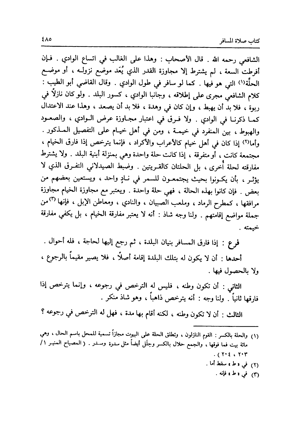 الشافعي رحمه الله. قال الاصحاب: وهذا على الغالب في اتساع الوادي. فإن أفرطت السعة، لم يشترط إلا مجاوزة القدر الذي يعد موضع نزوله، أو موضع الحلة (1) التي هو فيها. كما لو سافر في طول الوادي. وقال القاضي أبو الطيب: كلام الشافعي مجرى على إطلاقه، وجانبا الوادي، كسور البلد. ولو كان نازلا في ربوة، فلا بد أن يهبط، وإن كان في وهدة، فلا بد أن يصعد، وهذا عند الاعتدال كما ذكرنا في الوادي. ولا فرق في اعتبار مجاوزة عرض الوادي، والصعود والهبوط، بين المنفرد في خيمة، ومن في أهل خيام على التفصيل المذكور. أما (2) إذا كان في أهل خيام كالاعراب والاكراد، فإنما يترخص إذا فارق الخيام، مجتمعة كانت، أو متفرقة، إذا كانت حلة واحدة وهي بمنزلة أبنية البلد. ولا يشترط مفارقته لحلة أخرى، بل الحلتان كالقريتين. وضبط الصيدلاني التفرق الذي لا يؤثر، بأن يكونوا بحيث يجتمعون للسمر في ناد واحد، ويستعين بعضهم من بعض. فإن كانوا بهذه الحالة، فهي حلة واحدة. ويعتبر مع مجاوزة الخيام مجاوزة مرافقها، كمطرح الرماد، وملعب الصبيان، والنادي، ومعاطن الابل، فإنها (3) من جملة مواضع إقامتهم. ولنا وجه شاذ: أنه لا يعتبر مفارقه الخيام، بل يكفي مفارقة خيمته. فرع: إذا فارق المسافر بنيان البلدة، ثم رجع إليها لحاجة، فله أحوال. أحدها: أن لا يكون له بتلك البلدة إقامة أصلا، فلا يصير مقيما بالرجوع، ولا بالحصول فيها. الثاني: أن تكون وطنه، فليس له الترخص في رجوعه، وإنما يترخص إذا فارقها ثانيا. ولنا وجه: أنه يترخص ذاهبا، وهو شاذ منكر. الثالث: أن لا تكون وطنه، لكنه أقام بها مدة، فهل له الترخص في رجوعه ؟