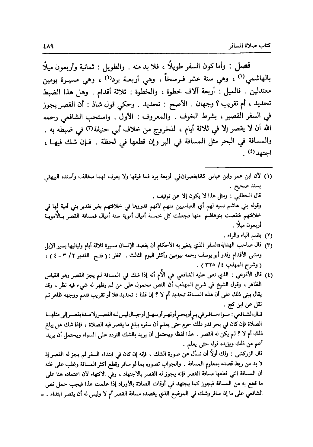 فصل: وأما كون السفر طويلا، فلا بد منه. والطويل: ثمانية وأربعون ميلا بالهاشمي (1)، وهي ستة عشر فرسخا، وهي أربعة برد (2)، وهي مسيرة يومين معتدلين. فالميل: أربعة آلاف خطوة، والخطوة: ثلاثة أقدام. وهل هذا الضبط تحديد، أم تقريب ؟ وجهان. الاصح: تحديد. وحكي قول شاذ: أن القصر يجوز في السفر القصير، بشرط الخوف. والمعروف: الاول. واستحب الشافعي رحمه الله أن لا يقصر إلا في ثلاثة أيام، للخروج من خلاف أبي حنيفة (3) في ضبطه به. والمسافة في البحر مثل المسافة في البر وإن قطعها في لحظة. فإن شك فيها، اجتهد (4).