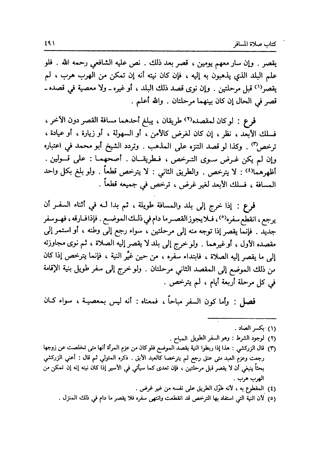 يقصر. وإن سار معهم يومين، قصر بعد ذلك. نص عليه الشافعي رحمه الله. فلو علم البلد الذي يذهبون به إليه، فإن كان نيته أنه إن تمكن من الهرب هرب، لم يقصر (1) قبل مرحلتين. وإن نوى قصد ذلك البلد، أو غيره - ولا معصية في قصده - قصر في الحال إن كان بينهما مرحلتان. والله أعلم. فرع: لو كان لمقصده (2) طريقان، يبلغ أحدهما مسافة القصر دون الآخر، فسلك الابعد، نظر، إن كان لغرض كالامن، أو السهولة، أو زيادة، أو عيادة، ترخص (3). وكذا لو قصد التنزه على المذهب. وتردد الشيخ أبو محمد في اعتباره وإن لم يكن غرض سوى الترخص، فطريقان. أصحهما: على قولين. أظهرهما (4): لا يترخص. والطريق الثاني: لا يترخص قطعا. ولو بلغ بكل واحد المسافة، فسلك الابعد لغير غرض، ترخص في جميعه قطعا. فرع: إذا خرج إلى بلد والمسافة طويلة، ثم بدا له في أثناء السفر أن يرجع، انقطع سفره (5)، فلا يجوز القصر ما دام في ذلك الموضع. فإذا فارقه، فهو سفر جديد. فإنما يقصر إذا توجه منه إلى مرحلتين، سواء رجع إلى وطنه، أو استمر إلى مقصده الاول، أو غيرهما. ولو خرج إلى بلد لا يقصر إليه الصلاة، ثم نوى مجاوزته إلى ما يقصر إليه الصلاة، فابتداء سفره، من حين غير النية، فإنما يترخص إذا كان من ذلك الموضع إلى المقصد الثاني مرحلتان. ولو خرج إلى سفر طويل بنية الاقامة في كل مرحلة أربعة أيام، لم يترخص. فصل: وأما كون السفر مباحا، فمعناه: أنه ليس بمعصية، سواء كان