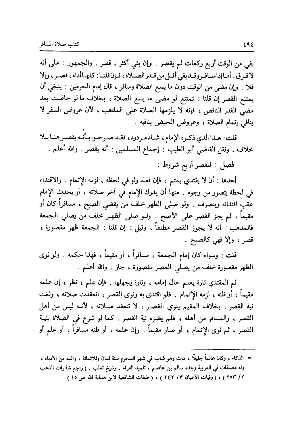 فصل: للقصر أربع شروط : أحدها: أن لا يقتدي بمتم، فإن فعله ولو في لحظة، لزمه الاتمام. والاقتداء في لحظة يتصور من وجوه. منها أن يدرك الامام في آخر صلاته، أو يحدث الامام عقب اقتدائه وينصرف. ولو صلى الظهر خلف من يقضي الصبح، مسافرا كان أو مقيما، لم يجز القصر على الاصح. ولو صلى الظهر خلف من يصلي الجمعة، فالمذهب: أنه لا يجوز القصر مطلقا، وقيل: إن قلنا: الجمعة ظهر مقصورة، قصر، وإلا فهي كالصبح. قلت: وسواء كان إمام الجمعة، مسافرا، أو مقيما، فهذا حكمه. ولو نوى الظهر مقصورة خلف من يصلي العصر مقصورة، جاز. والله أعلم. ثم المقتدي تارة يعلم حال إمامه، وتحرة يجهلها. فإن علم، نظر، إن علمه مقيما، أو ظنه، لزمه الاتمام. فلو اقتدى به ونوى القصر، انعقدت صلاته، ولغت نية القصر. بخلاف المقيم ينوي القصر، لا تنعقد صلاته، لانه ليس من أهل القصر، والمسافر من أهله، فلم يضره نية القصر. كما لو شرع في الصلاة بنية القصر، ثم نوى الاتمام، أو صار مقيما. وإن علمه، أو ظنه مسافرا، أو علم أو